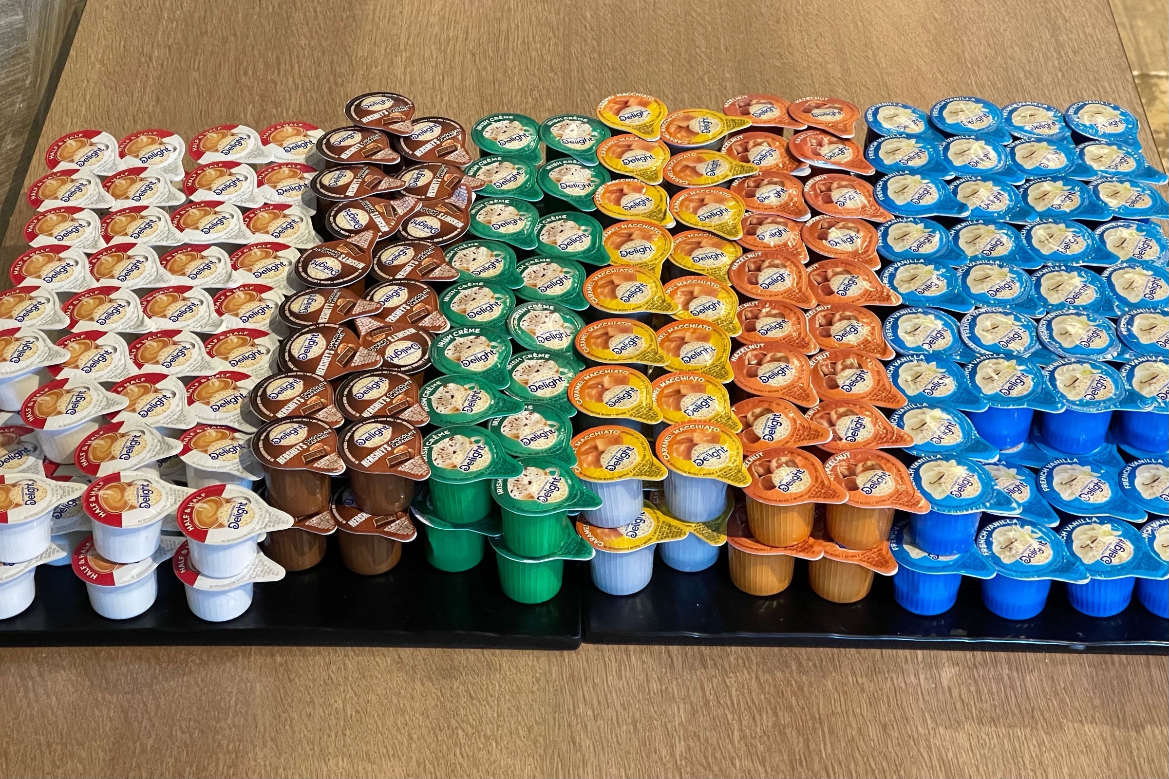 Coffee is poured fresh by the staff into paper cups, which seemed a bit less wasteful — until I encountered this heaping pile of tiny creamers.