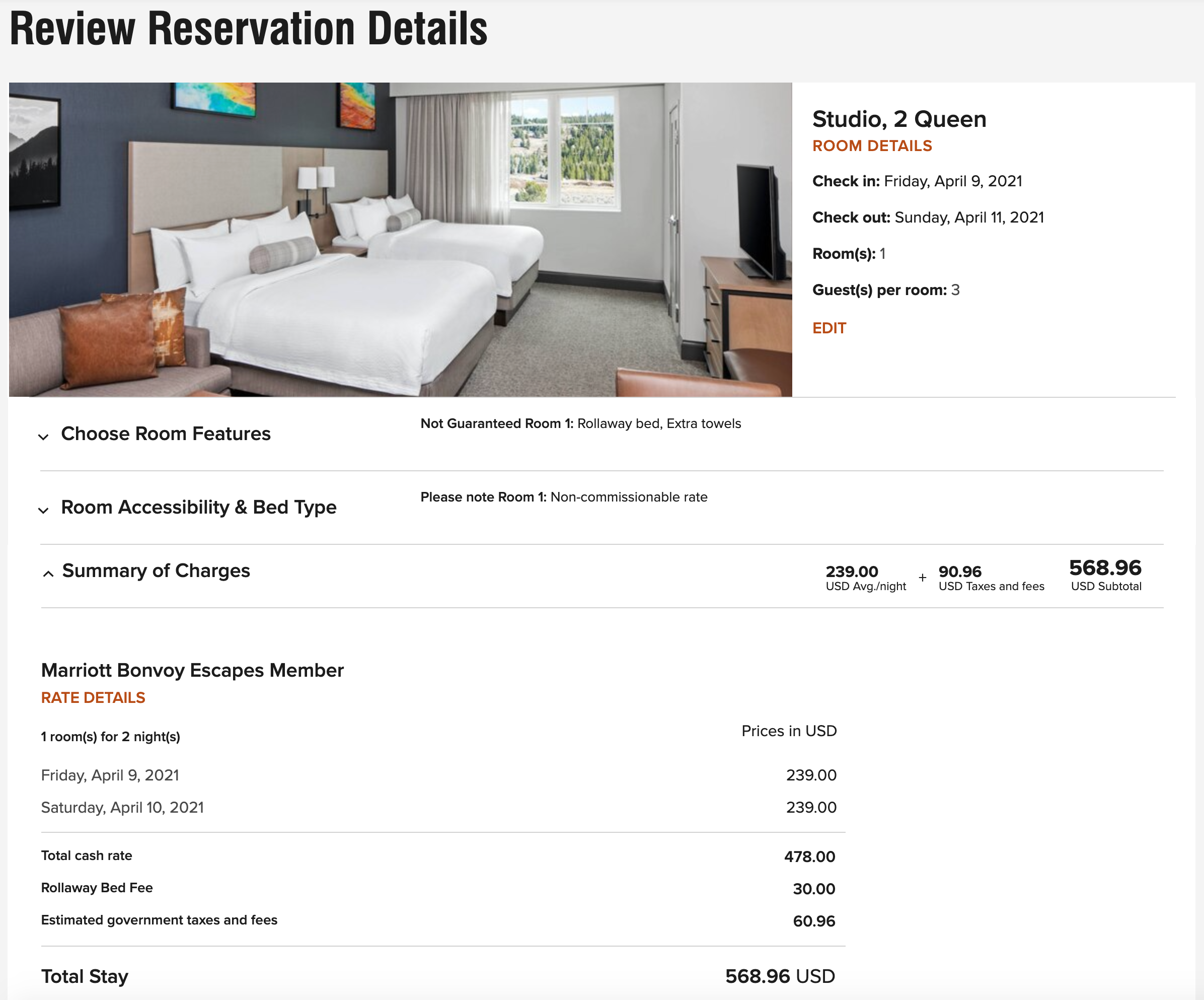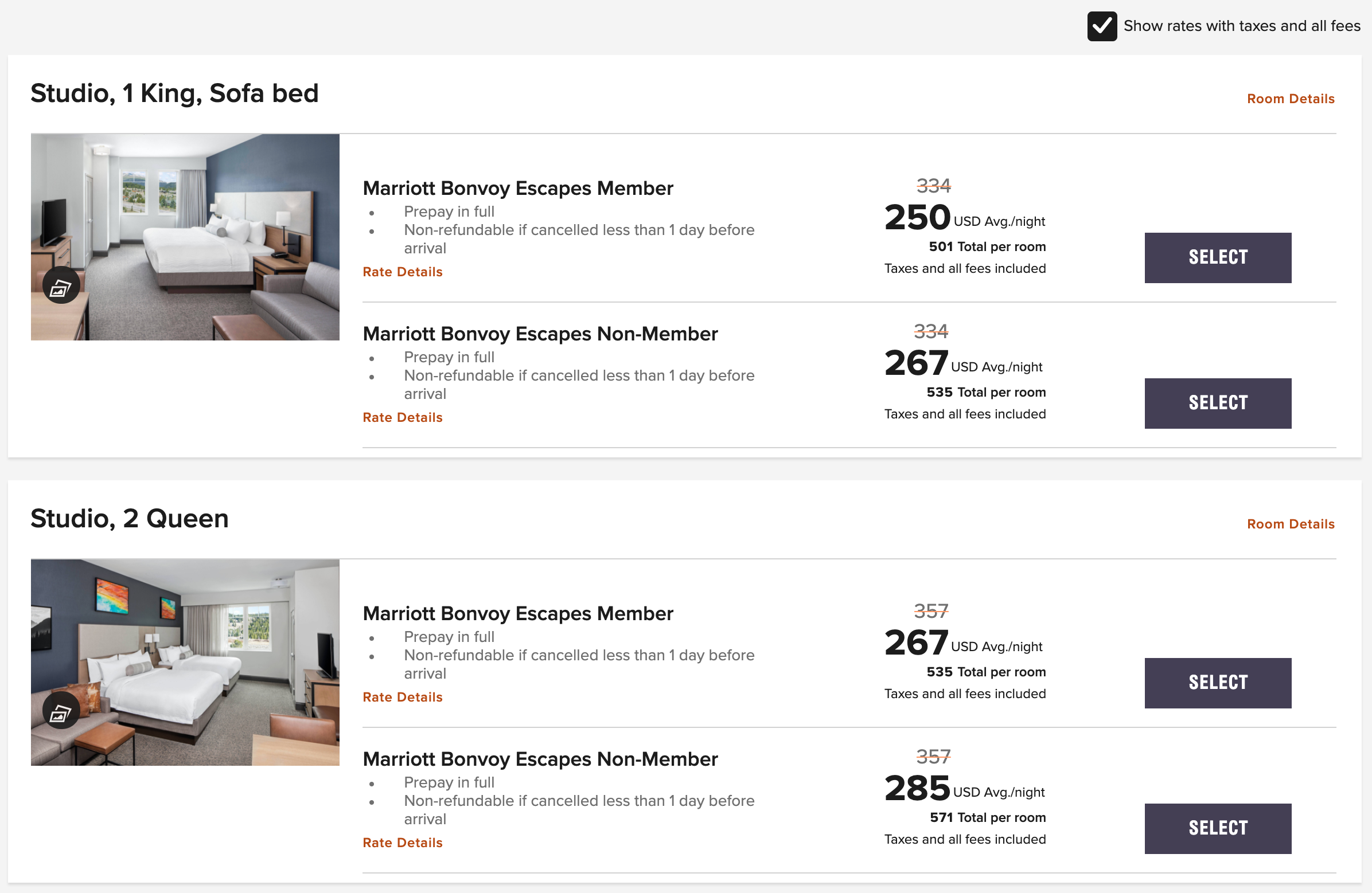 Naturally, that means it can command some fairly steep rates. For my shoulder-season stay, I was able to lock in a discounted rate of $267 per night for a room with two queens, including tax. During peak season, such as over the December holidays, you could be looking at upwards of $600 per night for a base room — certainly not typical for a Residence Inn.
