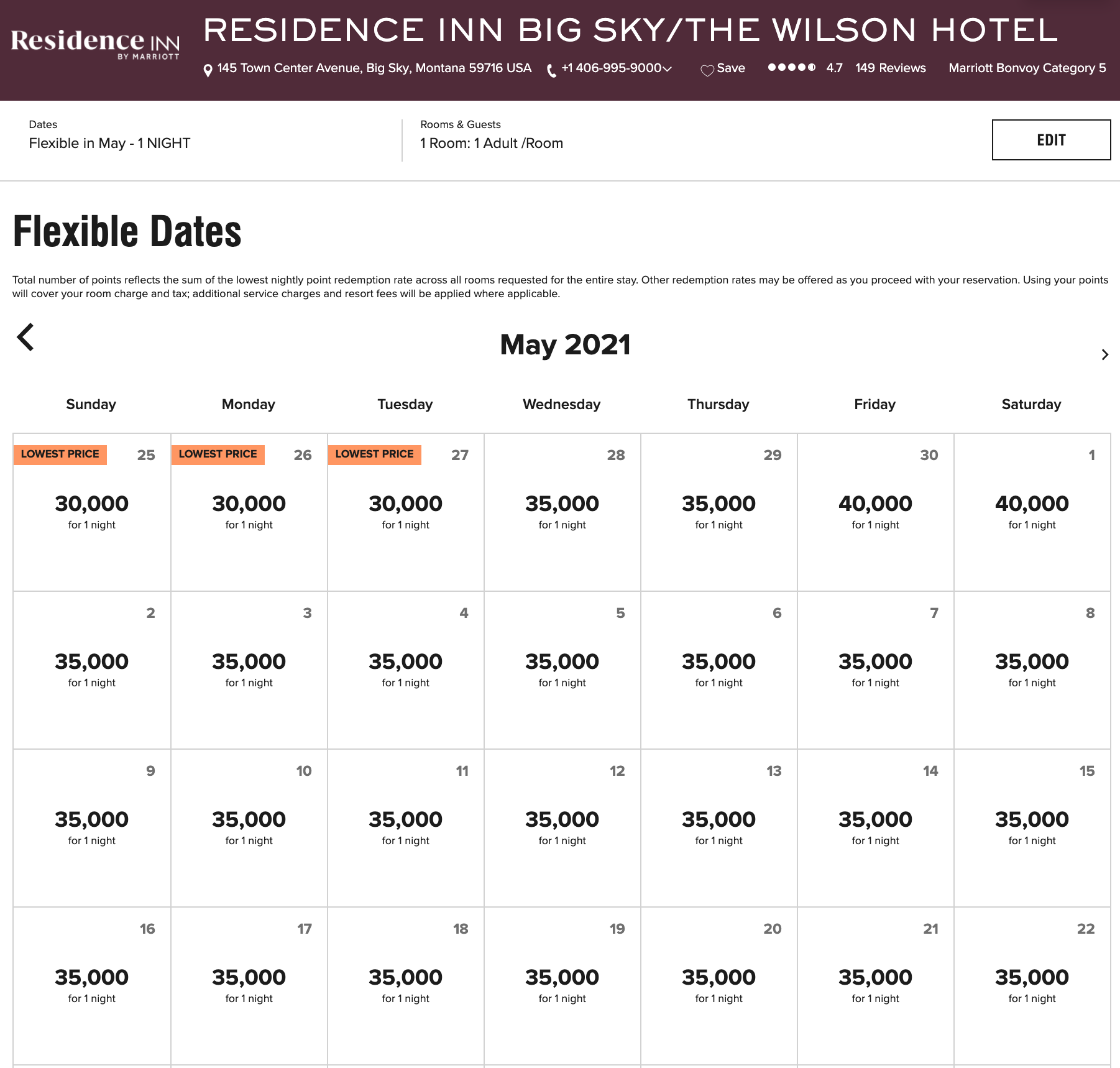 Most dates can be had at the standard 35,000-point level, making your stay eligible for the free-night certificates that come along with a handful of co-branded Marriott cards, including the Marriott Bonvoy Boundless Credit Card and the Marriott Bonvoy Business® American Express® Card.
