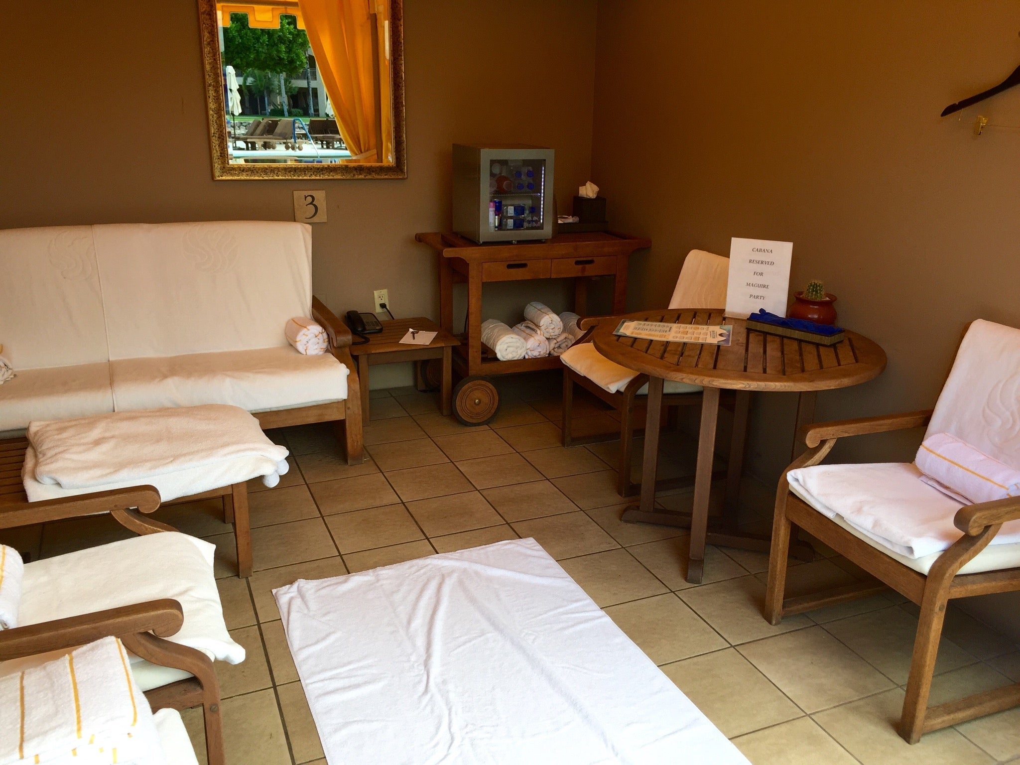 There are many cabanas surrounding this pool, but I'll warn you that they go for several hundred dollars per day. We passed on that pricey amenity this time around since there were plenty of chairs and umbrellas that met our needs just fine. However, if you have the cash to spare here is what the cabanas look like - they also come with some fruit, beverages, and a server.
