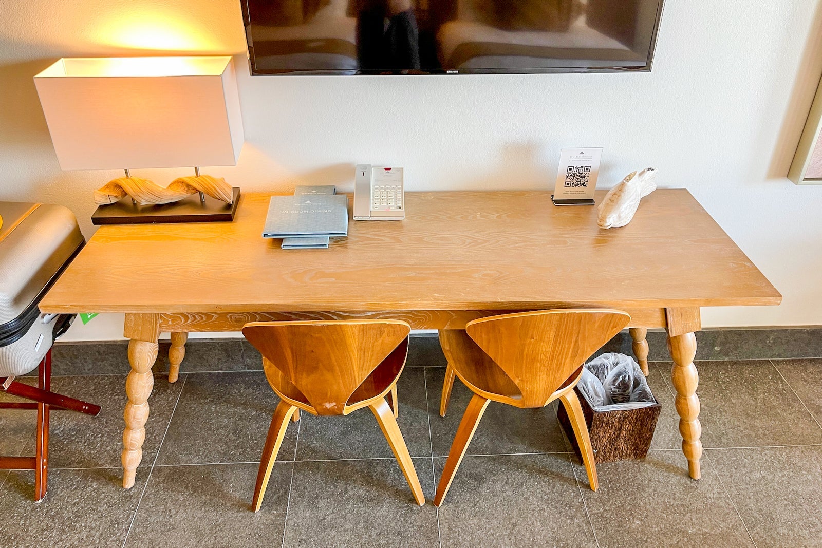 Across from the beds was a wall-mounted TV with premium movie channels, as well as a long table with two wooden chairs.
