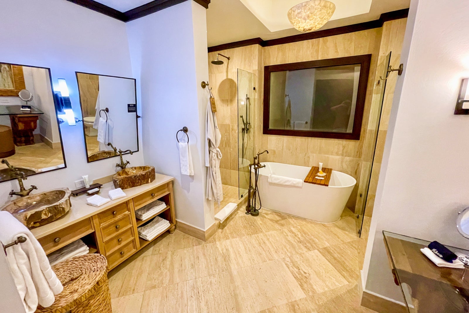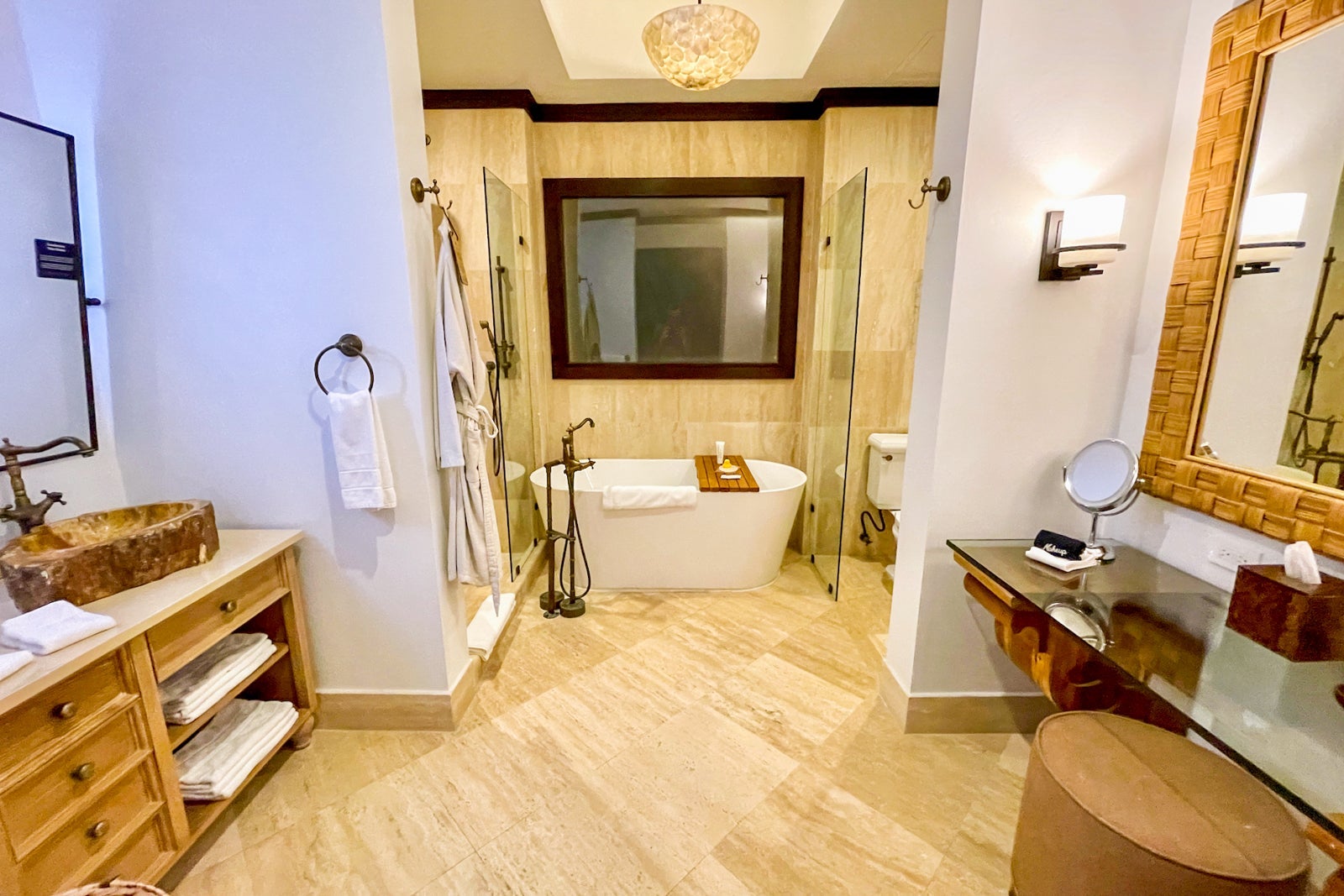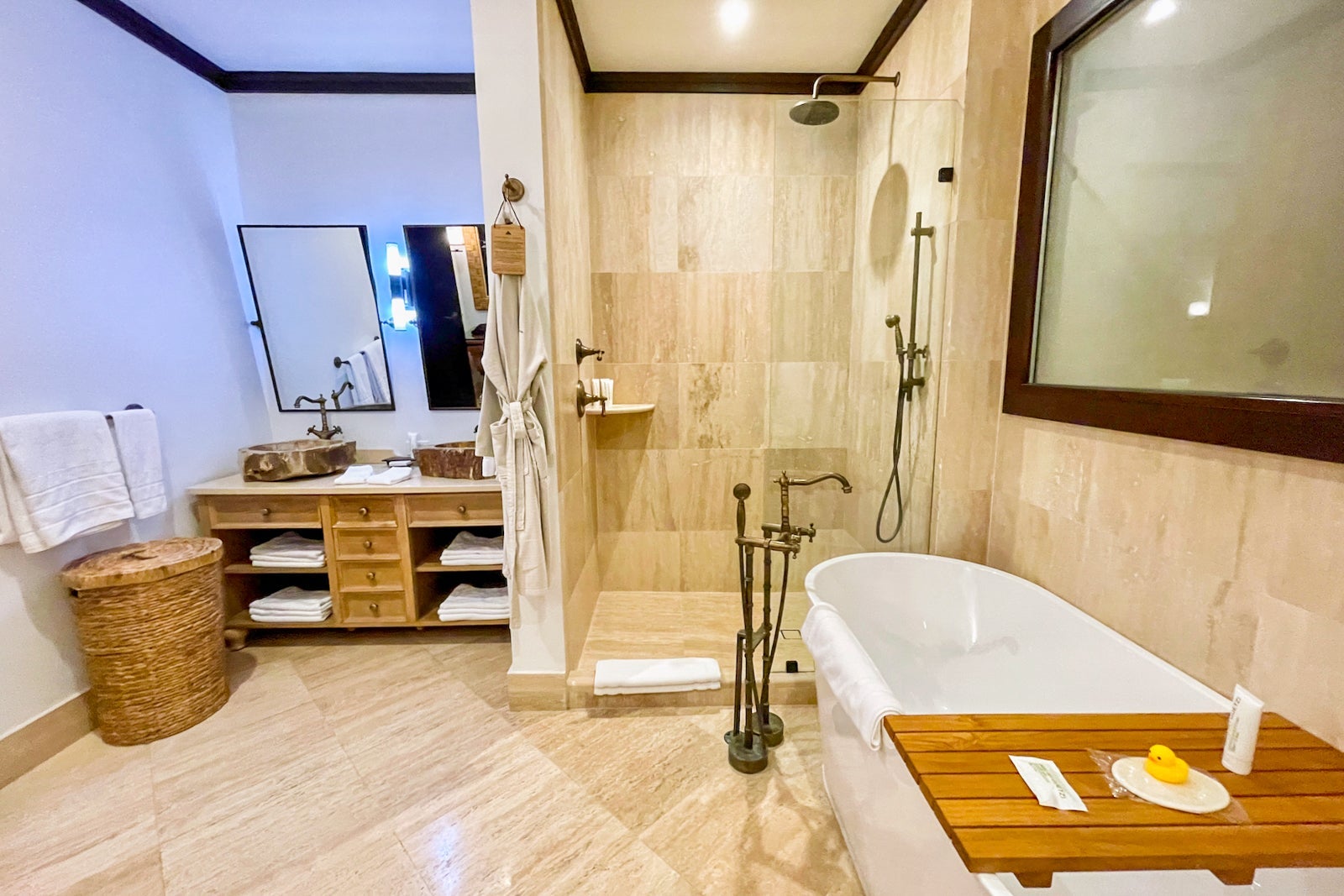 The bathroom was bright and large, featuring a vanity with two sinks, a walk-in shower and a separate makeup table. I loved the combination of unique materials in the bathroom like the stone sinks, copper piping and wooden accents. Toiletries were by Malin+Goetz and were rum-scented, fitting for this Caribbean resort.