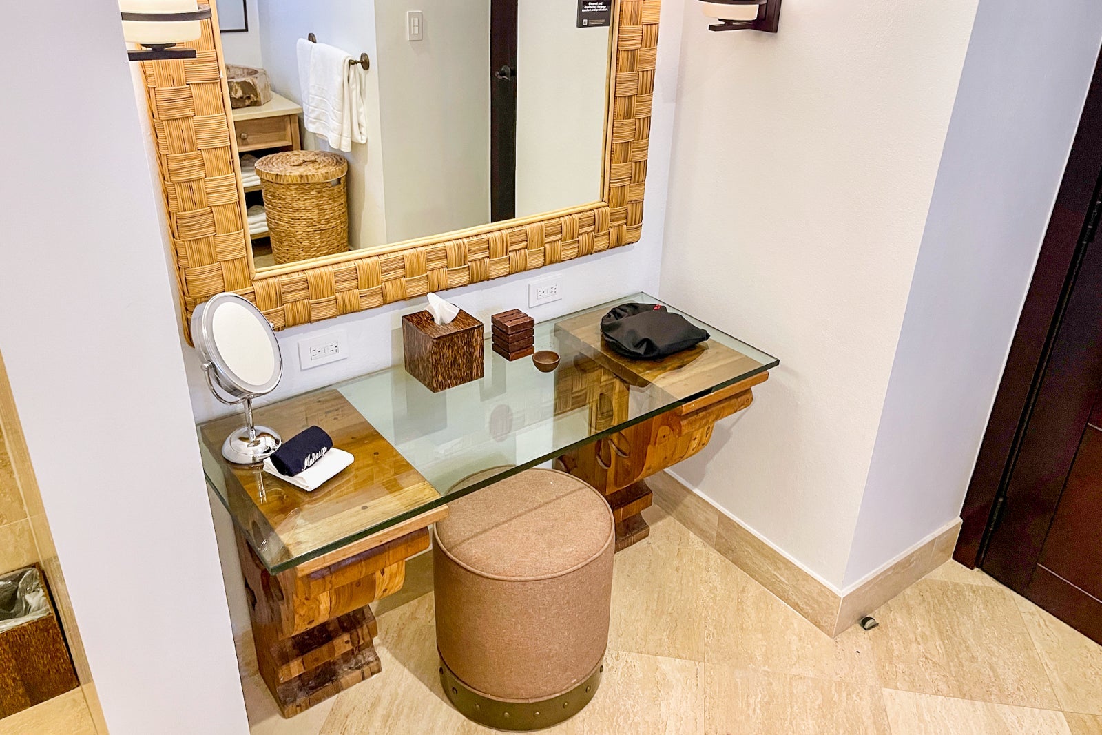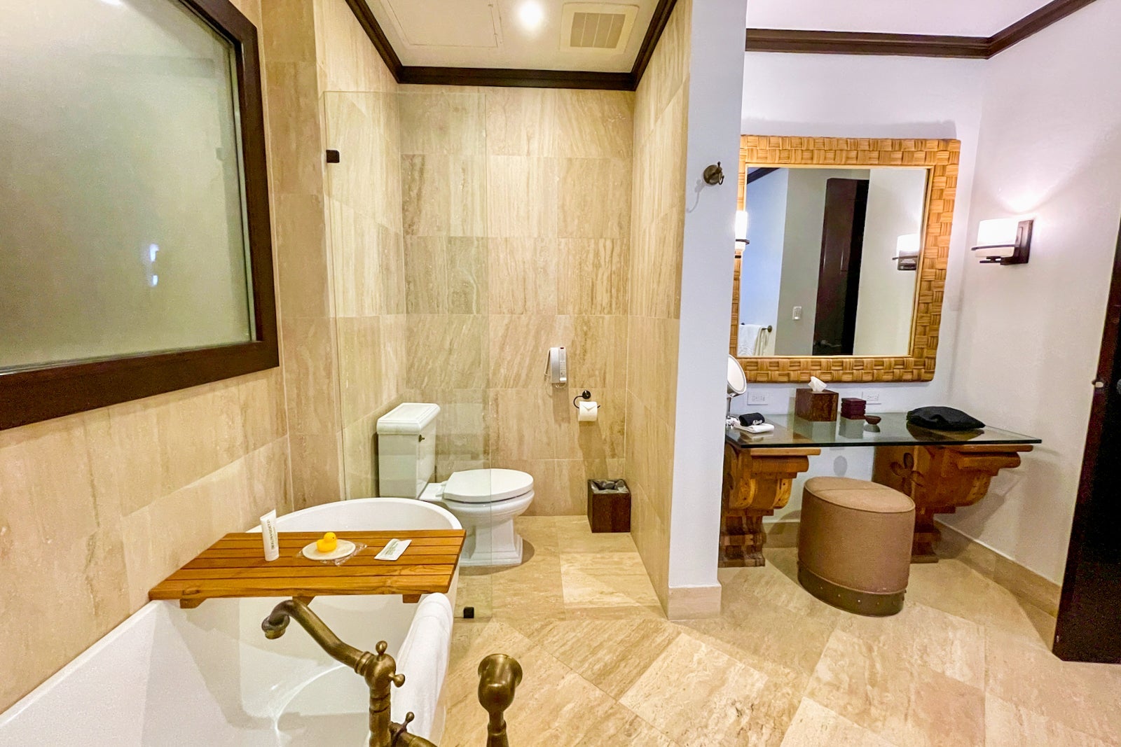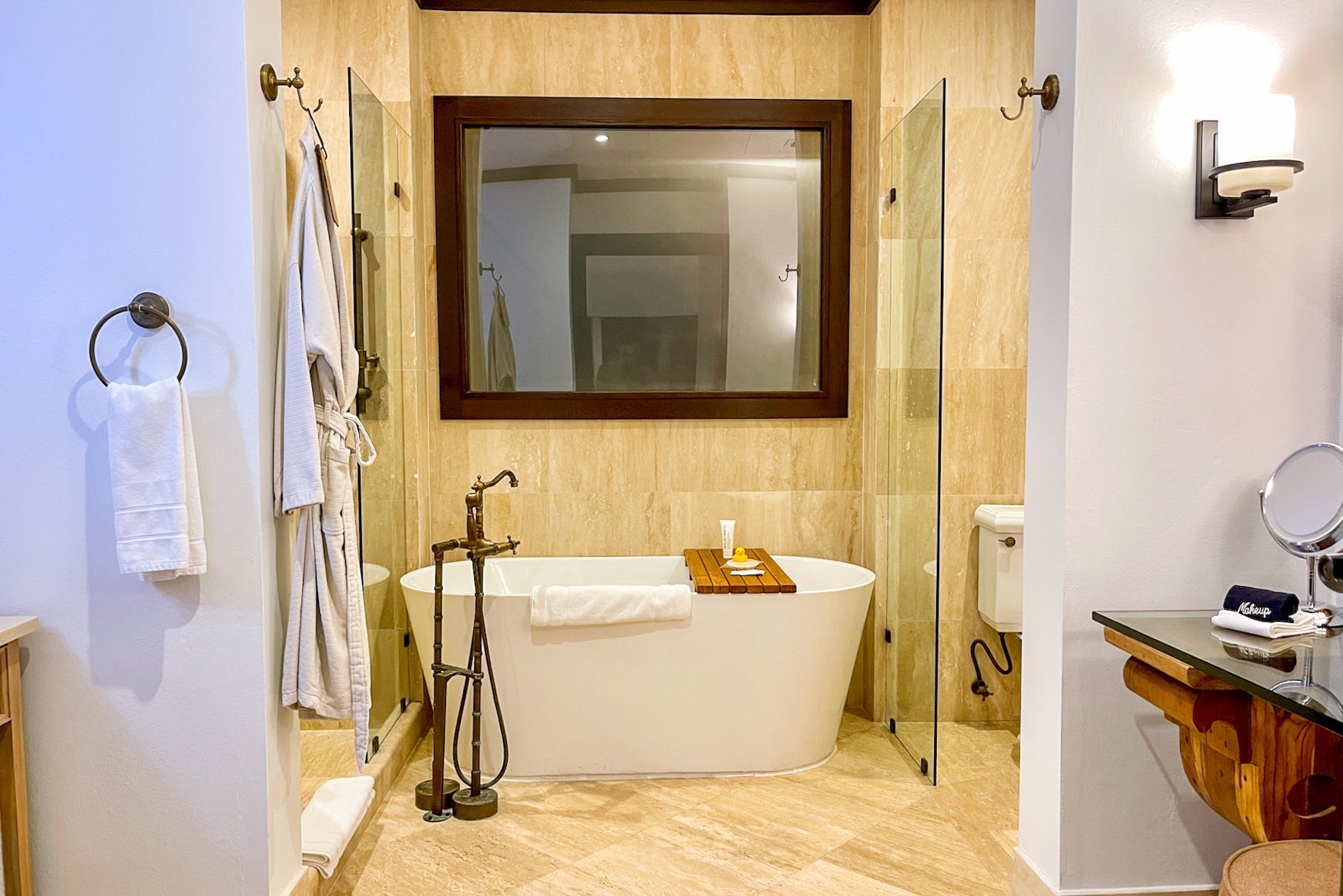 The bathroom was bright and large, featuring a vanity with two sinks, a walk-in shower and a separate makeup table. I loved the combination of unique materials in the bathroom like the stone sinks, copper piping and wooden accents. Toiletries were by Malin+Goetz and were rum-scented, fitting for this Caribbean resort.