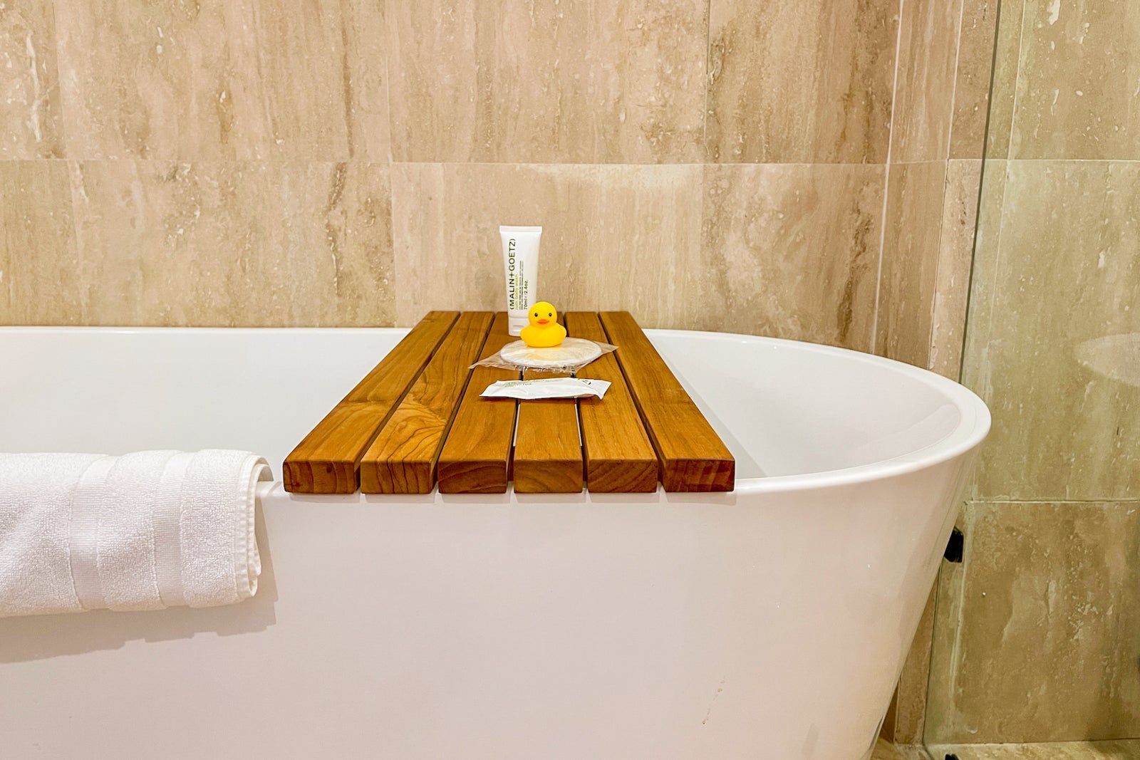 My favorite part of the room was the bathroom — and more specifically, the freestanding soaking bathtub. It was complete with a sliding wood bathtub tray stocked with bath salts, a loofah and a rubber duck.