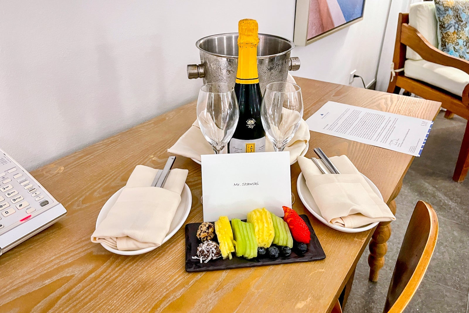 Upon arrival, there was a Diamond welcome gift waiting for me: a fruit plate and bottle of prosecco. During our days on the beach, the staff brought around fruit skewers, cold towels and once even free cucumber cocktails. Nightly turndown service was automatically provided and always included freshly baked cookies and water bottles.