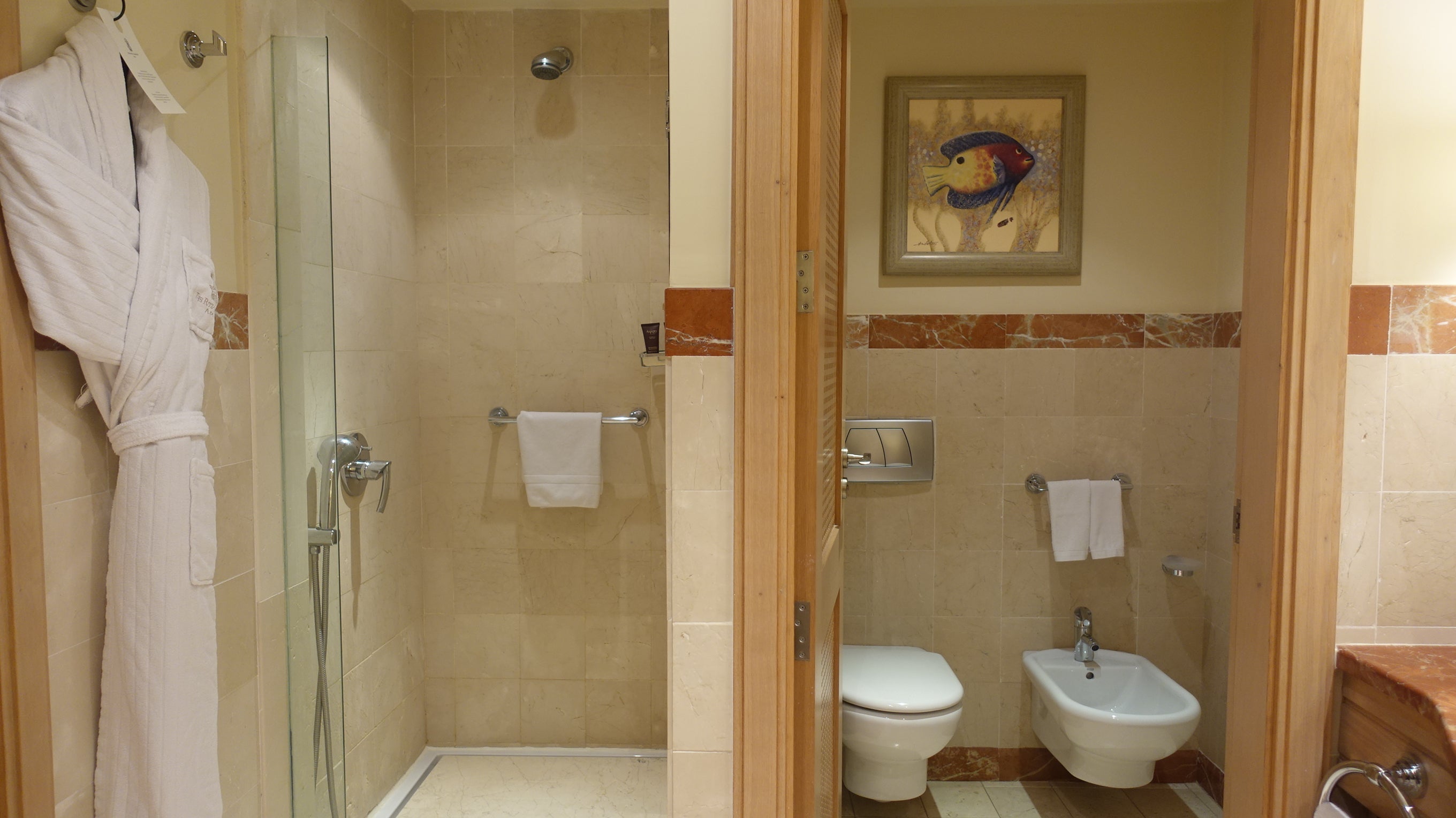 The bathroom, though slightly dated, was large and well-lit, with a big bathtub, separate shower and a small room for the toilet and bidet, as well as a vanity with double sinks, a hair dryer and a magnifying mirror.