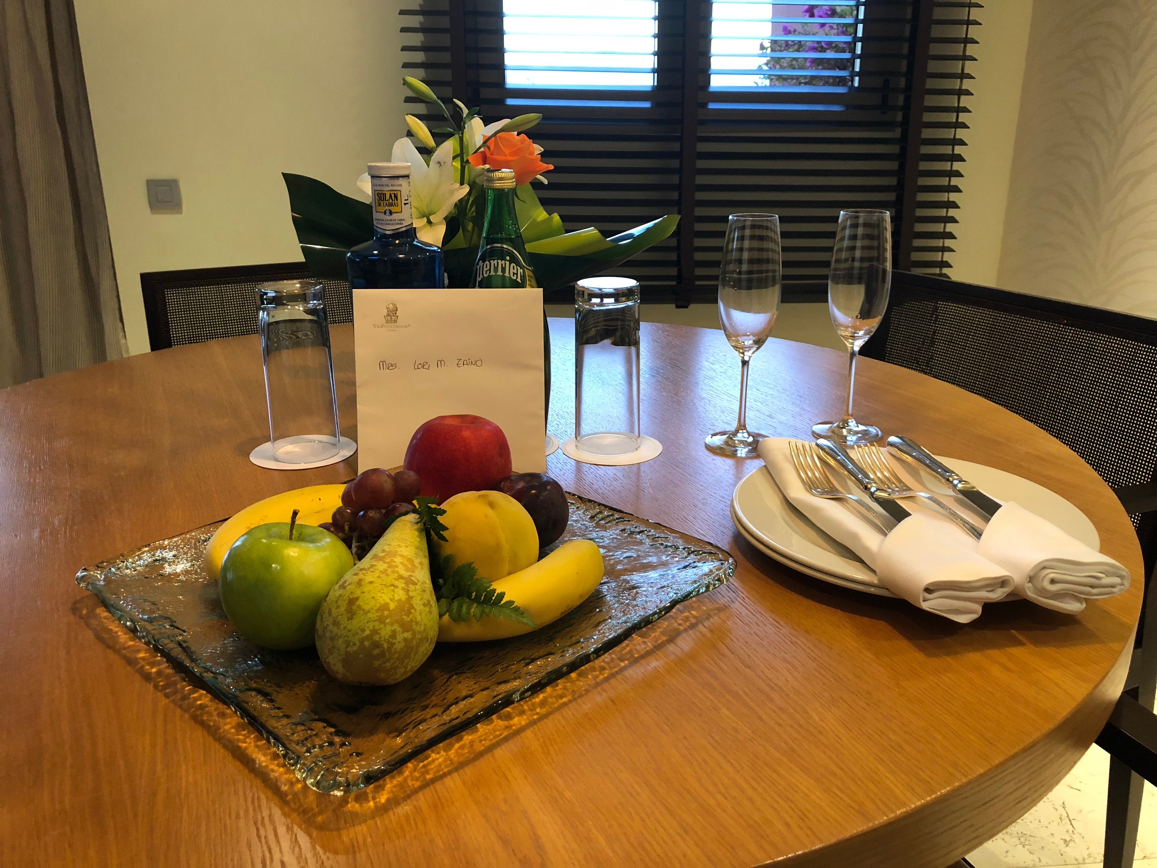 A fruit bowl and handwritten welcome note with a bottle of Perrier and mineral water were waiting for us on the table.