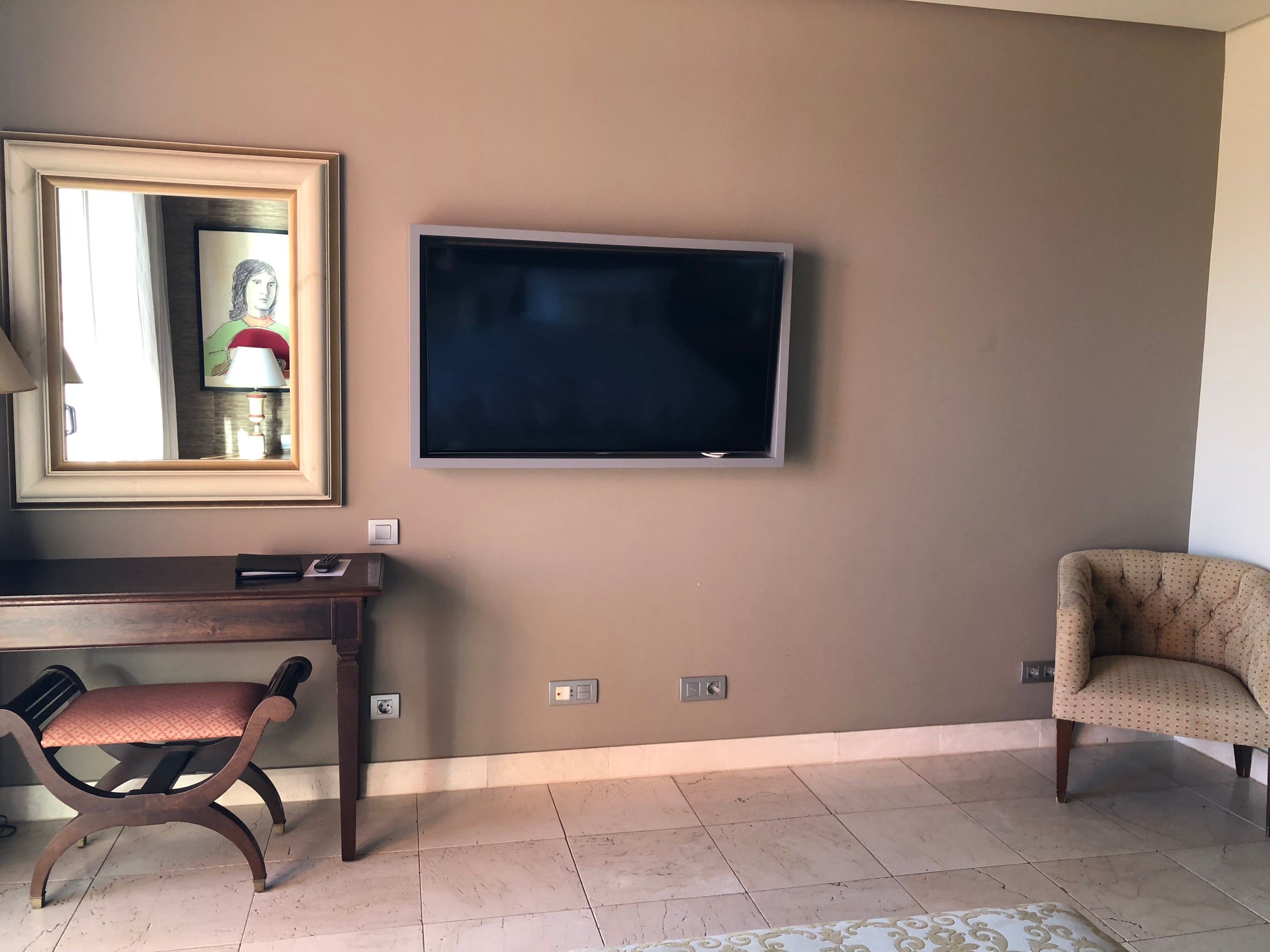 The bedroom had a large bed, a small vanity area (there was no desk) with a table, stool and mirror, an armchair, television and a few lamps. If I had needed to work, I could have done so at the table in the living area.