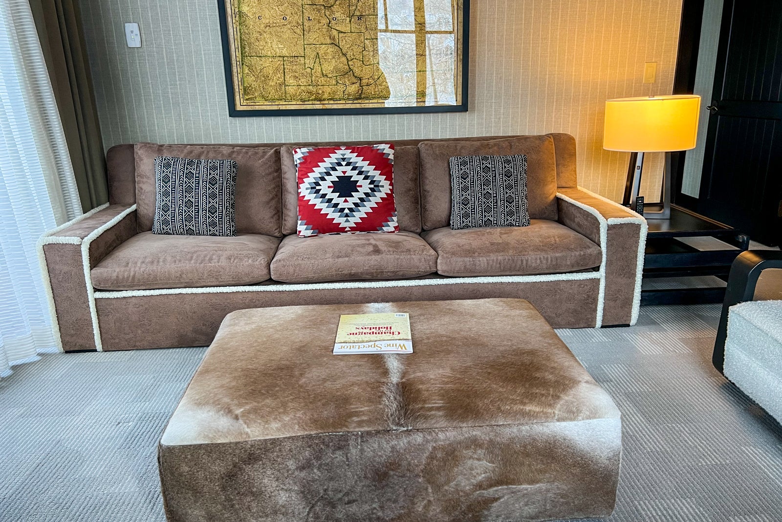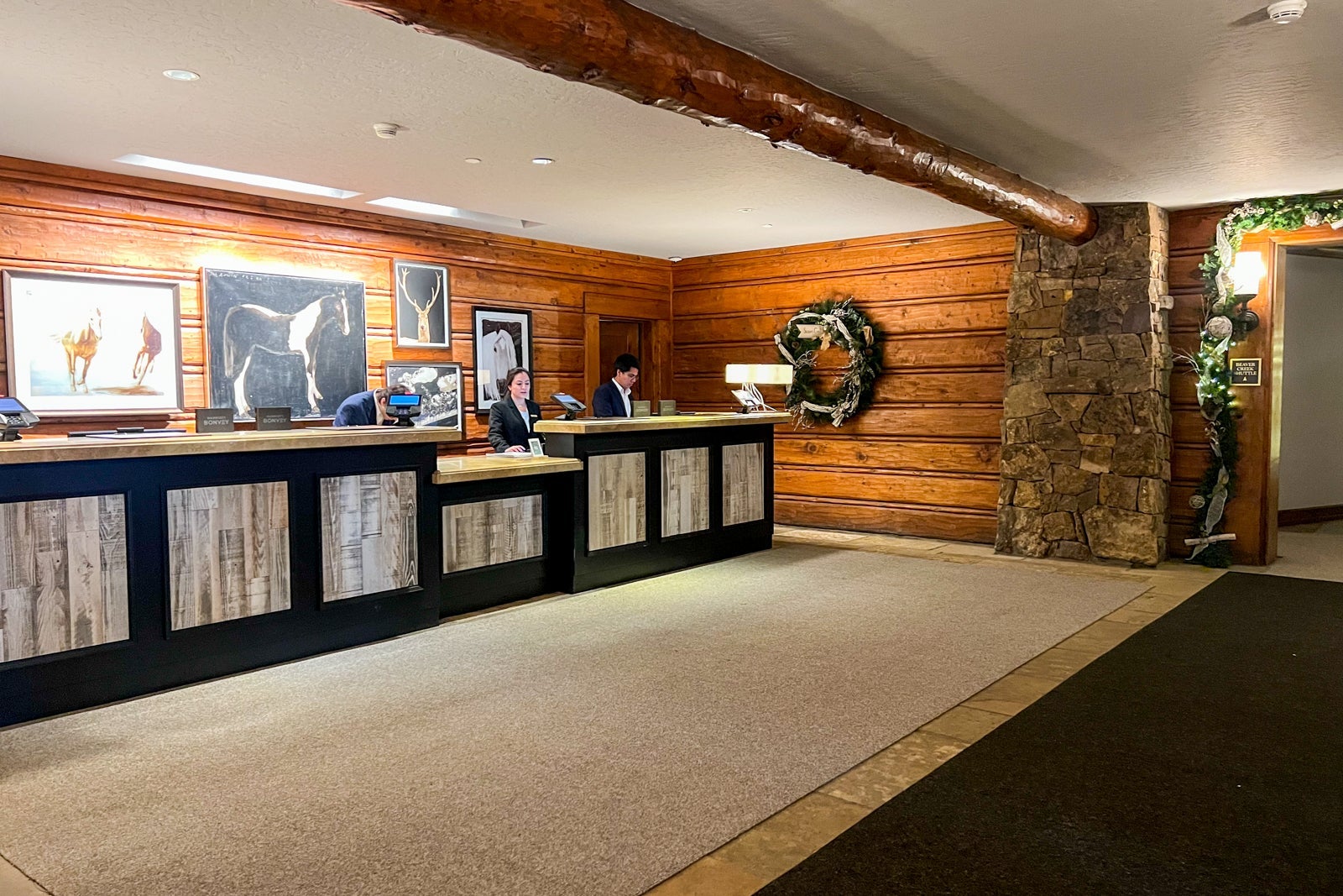We were greeted outside by a very friendly man in a cowboy hat who helped with our bags and directed us to the front desk. It was a warm greeting that carried over into the check-in area, which was just to the left of the fireplace inside the front doors.