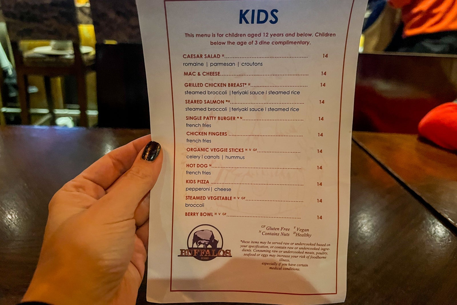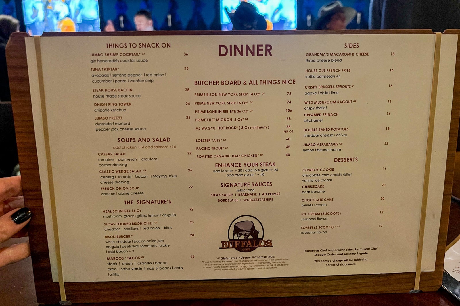 Buffalos is a casual restaurant, but it still gets very busy. Make reservations well in advance if you want to dine here. The menu includes items such as a buffalo burger, chili, mac and cheese and an amazing, warm, cowboy cookie served with a scoop of vanilla ice cream. The food is solid, even if prices are higher than you might wish, at $23 for a bowl of chili and $14 for kids meals.