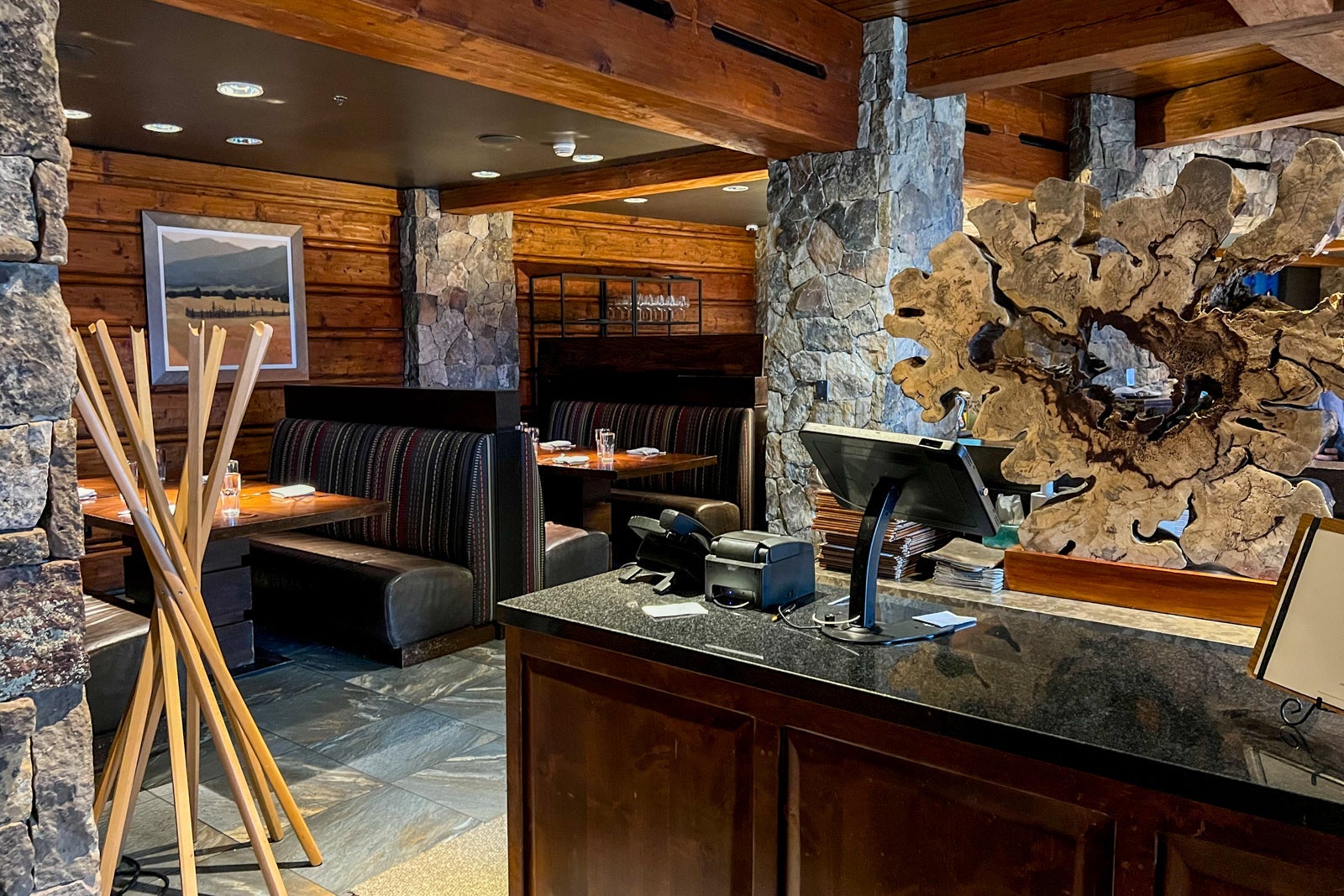 The check-in area, like the rest of the hotel, features a mix of natural materials such as wood and stone and earth-tone colors.