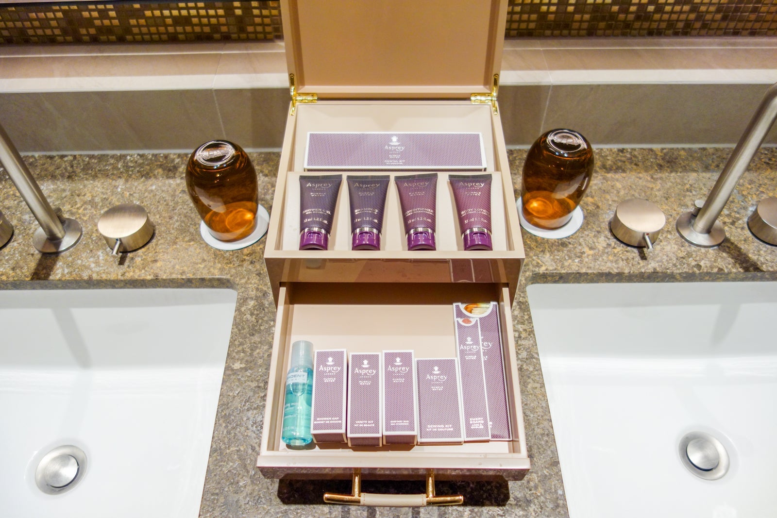 Ritz-Carlton's bathroom amenities are Asprey Purple Water. It is a nice luxury brand, but I really wish Ritz-Carlton would look into providing more place-specific products when possible. There was also a selection of other toiletries in case you had forgotten anything at home.