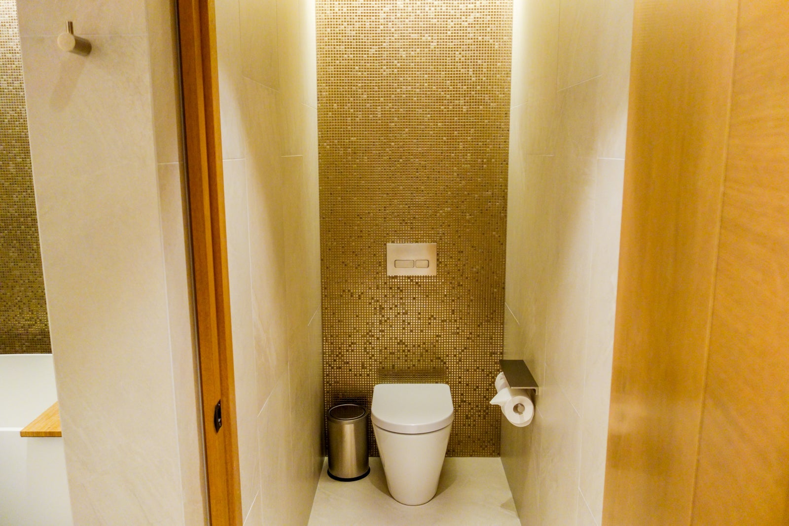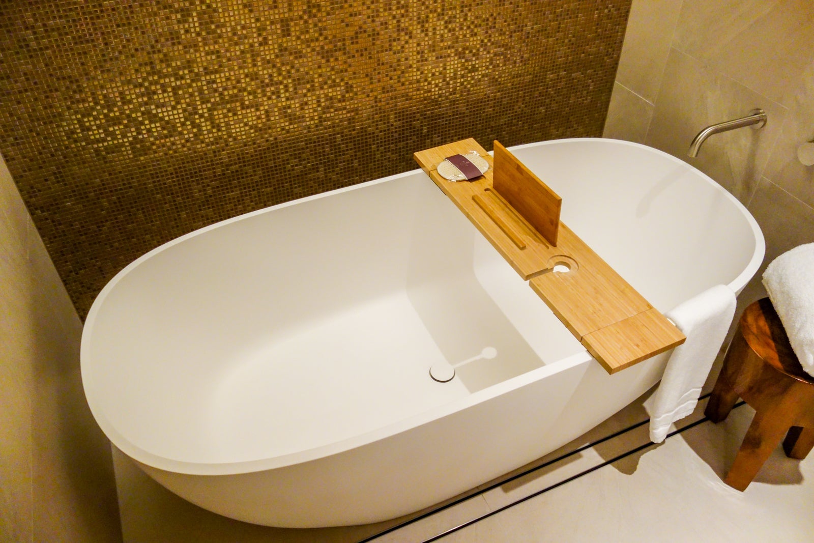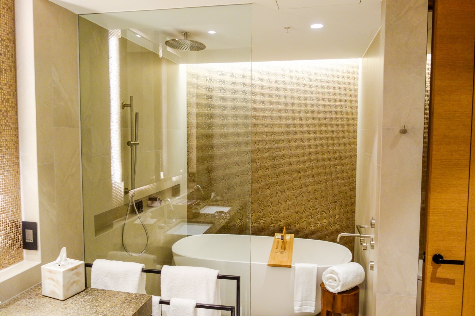 The shower had both handheld and rainfall shower heads, while the tub was a sophisticated deep-soaking model with a plank across it holding bath salts and a loofah. The look was stunning, but water splashed out on the rest of the bathroom floor.