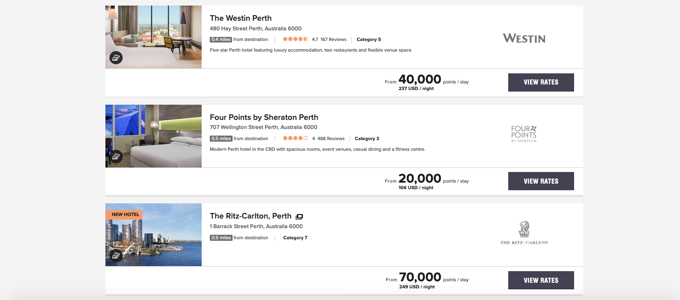 The Ritz-Carlton Perth is a Category 7 property. Award nights cost 50,000 points apiece at off-peak times, 60,000 points at standard rates or 70,000 points at peak pricing. For the next few months, you can often get award nights at all three levels within the same week. That makes it harder to pin down a good award reservation, but if you hit the 50,000-point mark, you might want to book it.