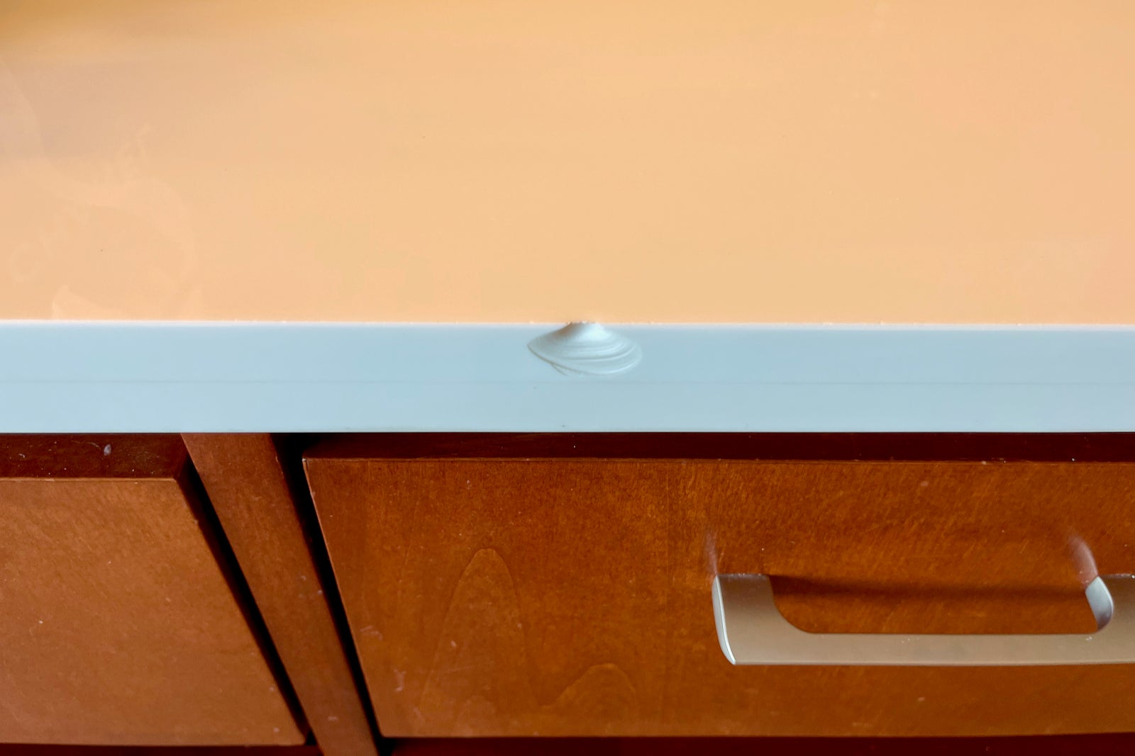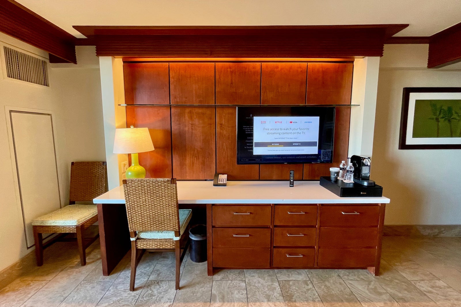 The TV, desk and dresser were all built into the wall opposite the bed. Like the closet, parts of the countertop were chipped as well.