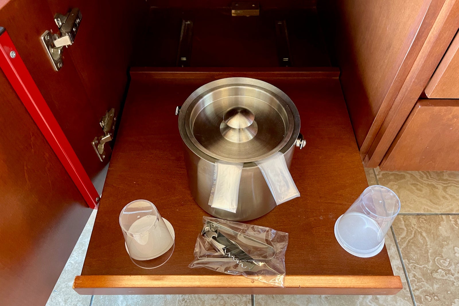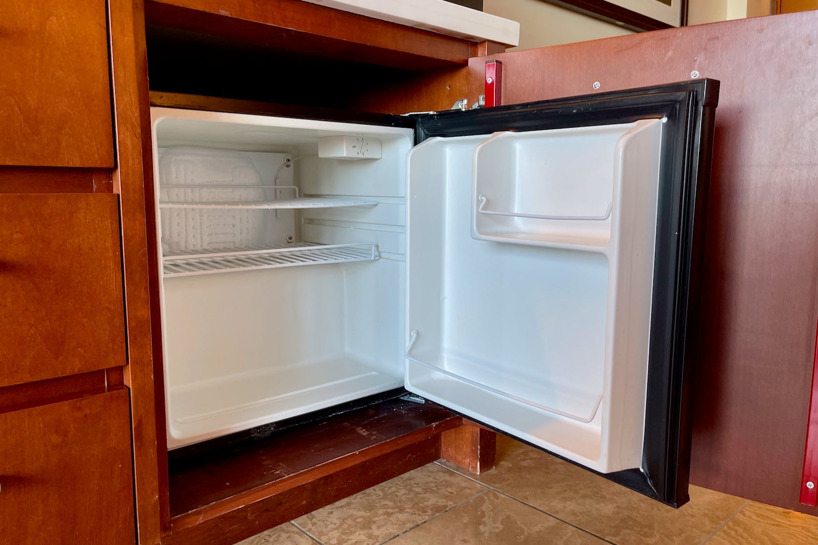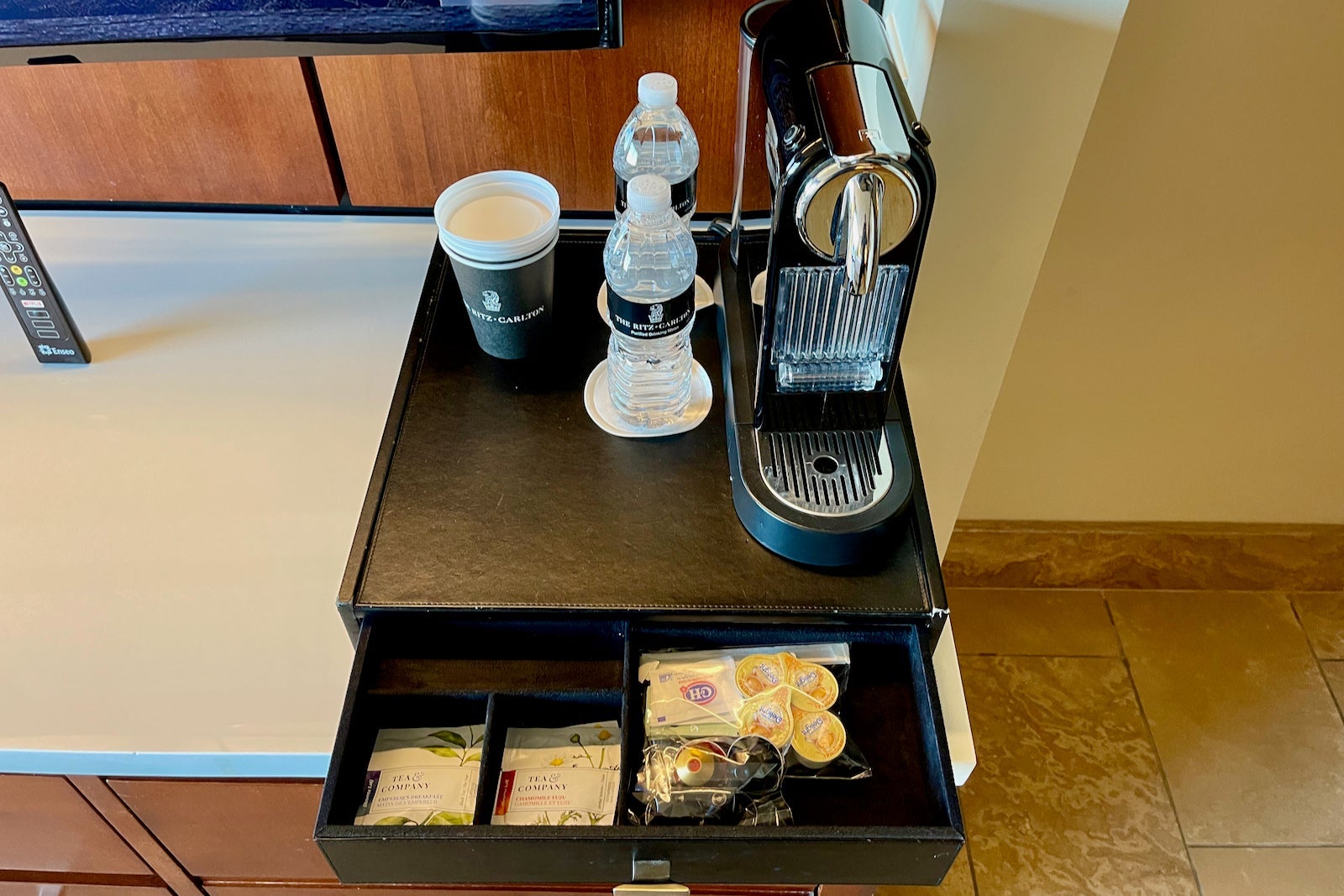 This is also where you'll find a Nespresso machine, as well as an empty mini fridge.