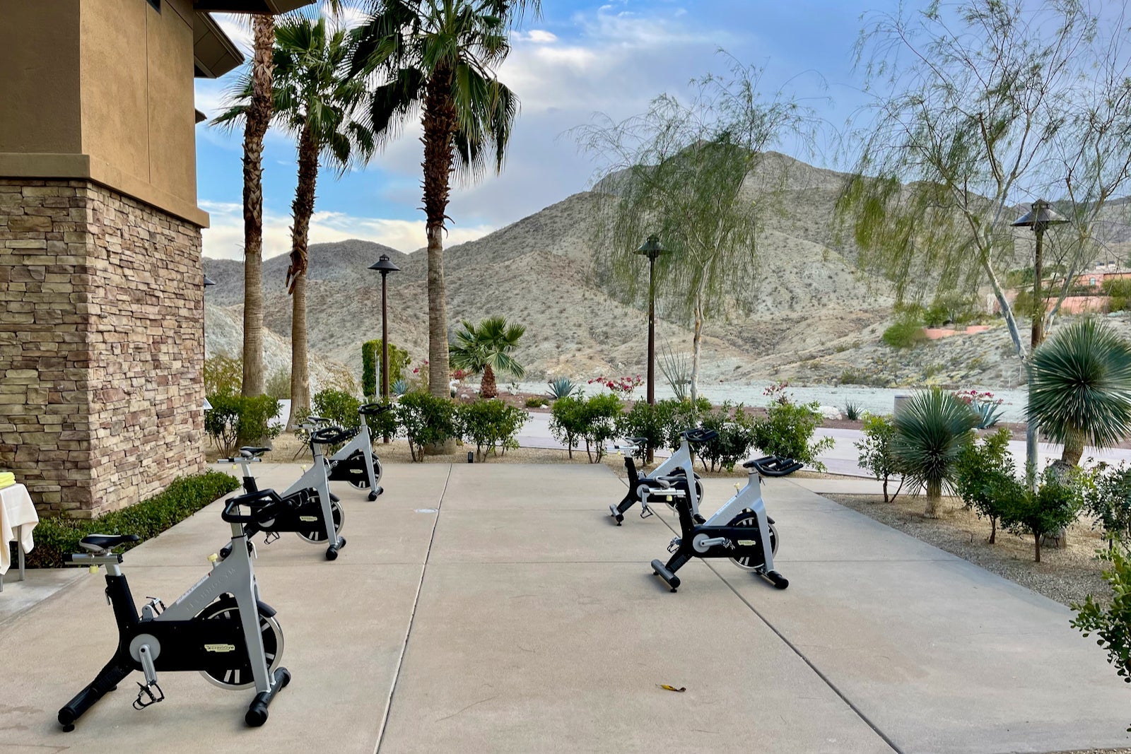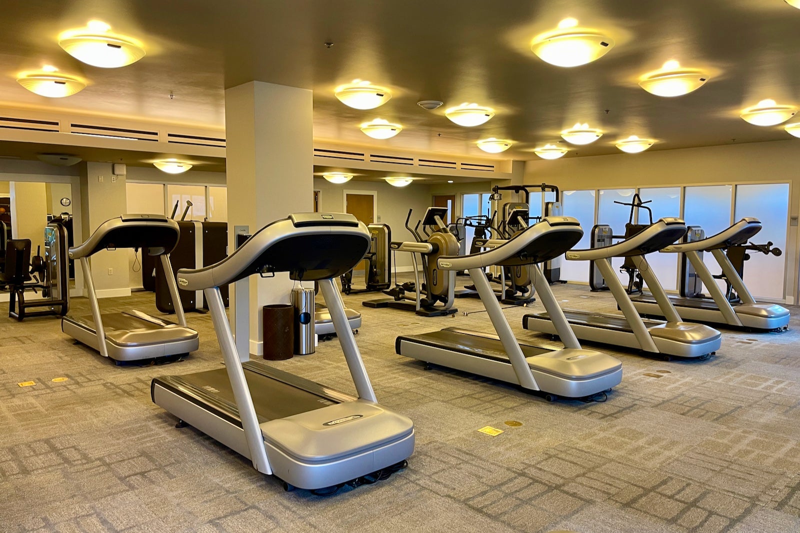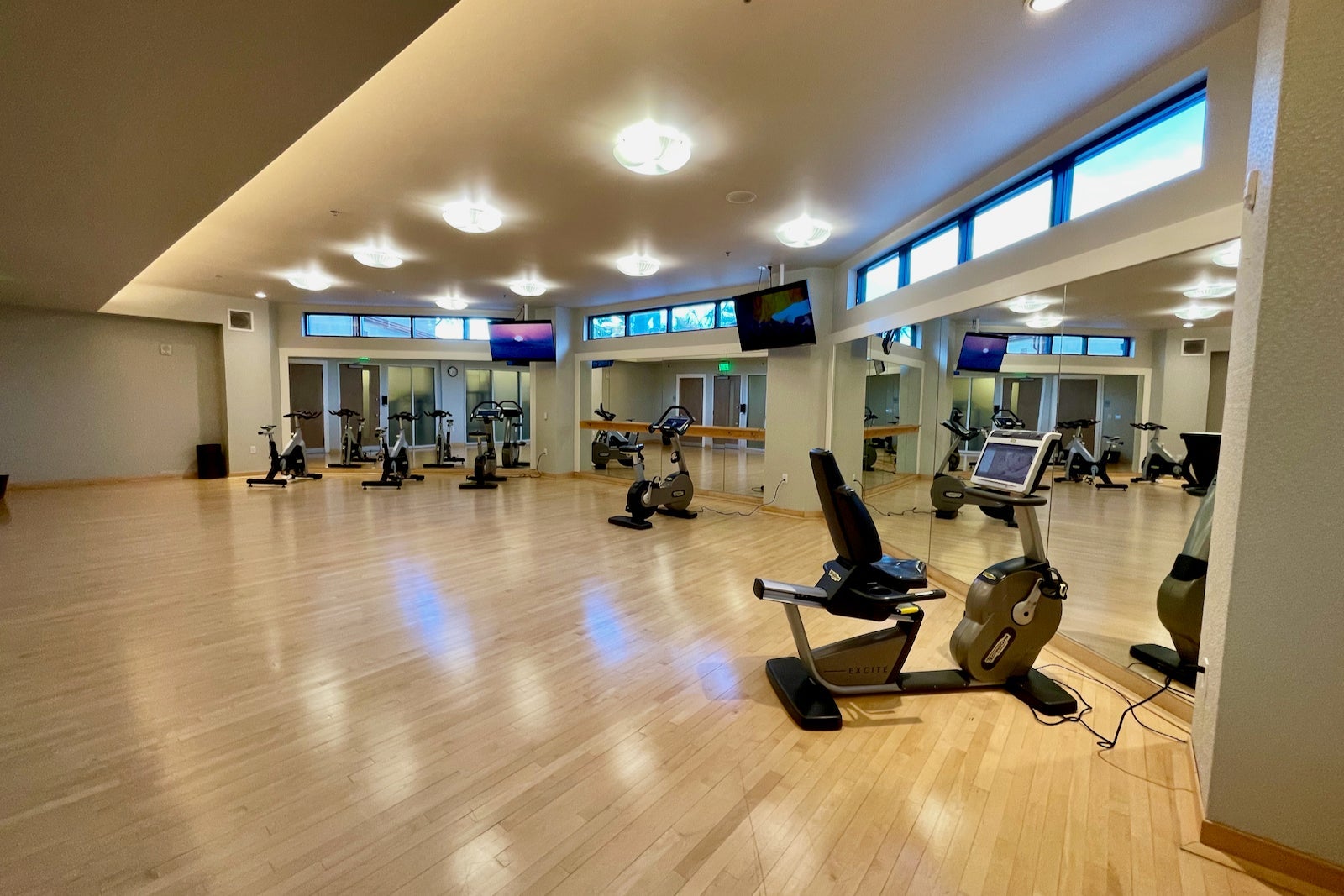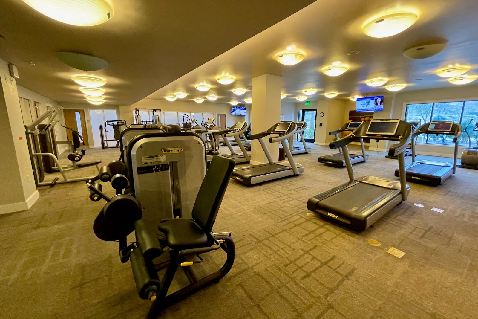 It featured multiple Technogym-branded ellipticals and treadmills. Spin bikes were located both in a separate multipurpose room and on the outdoor patio.