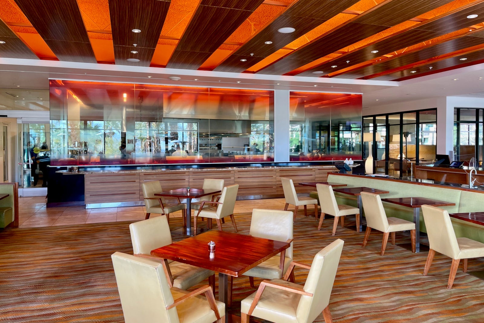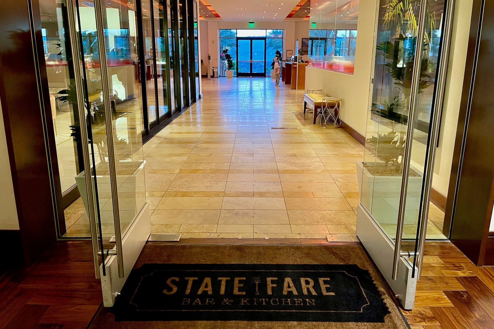 State Fare Kitchen and Lounge is the main all-day restaurant, located just past the lobby. It features a variety of socially distanced indoor and outdoor seating.