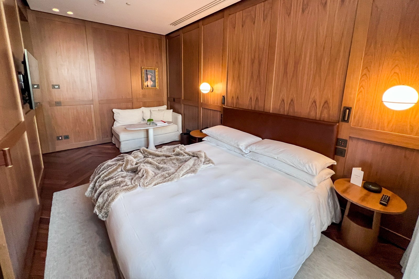 While wood paneling might usually make a space feel small, the room still felt spacious thanks to white accents on the furniture and bedding. There was a seating area with a small couch and table, and the bathroom included a walk-in rain shower and Le Labo amenities.