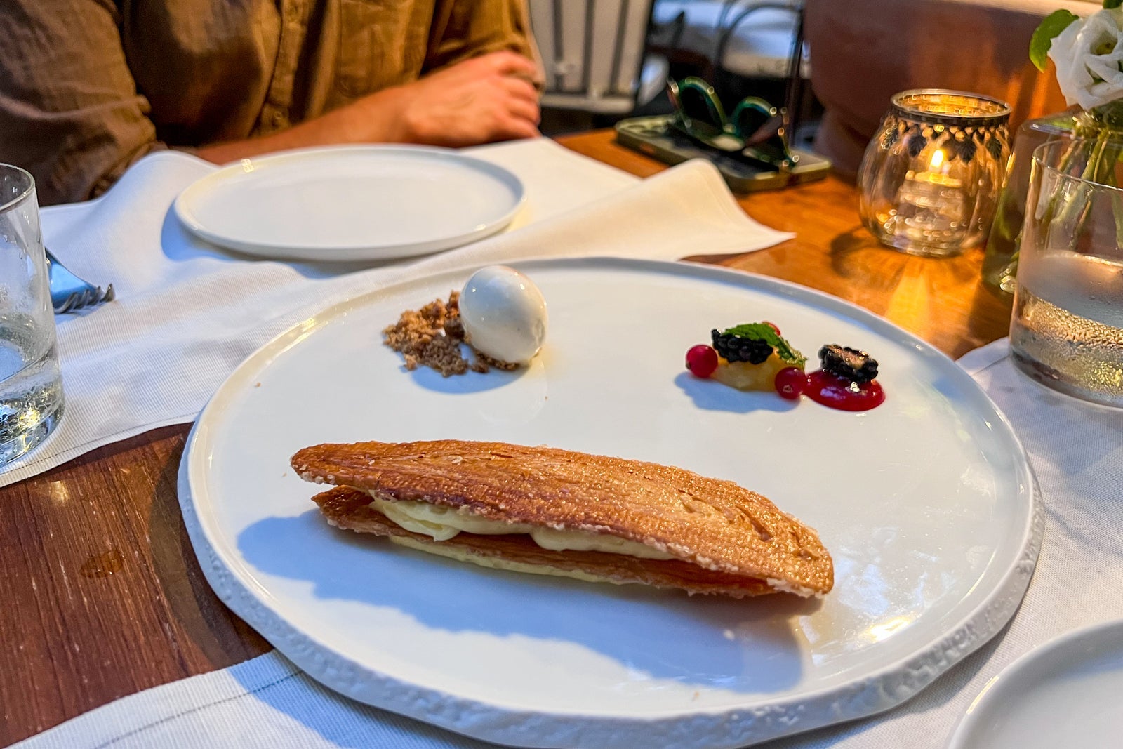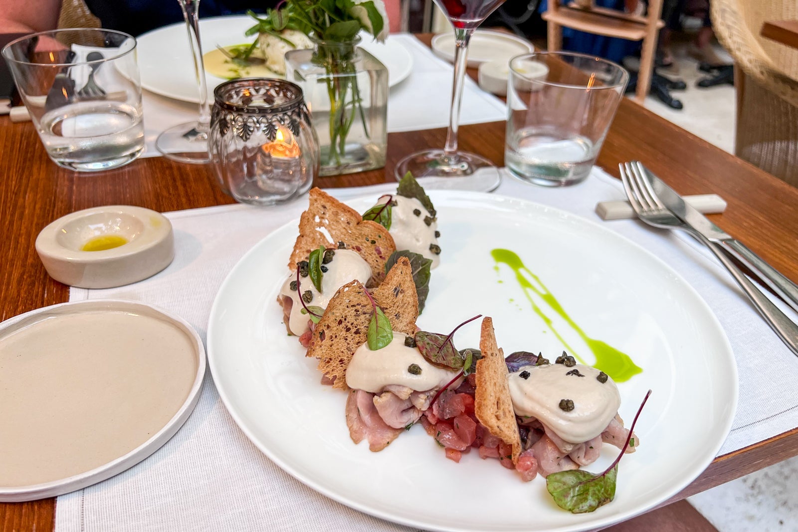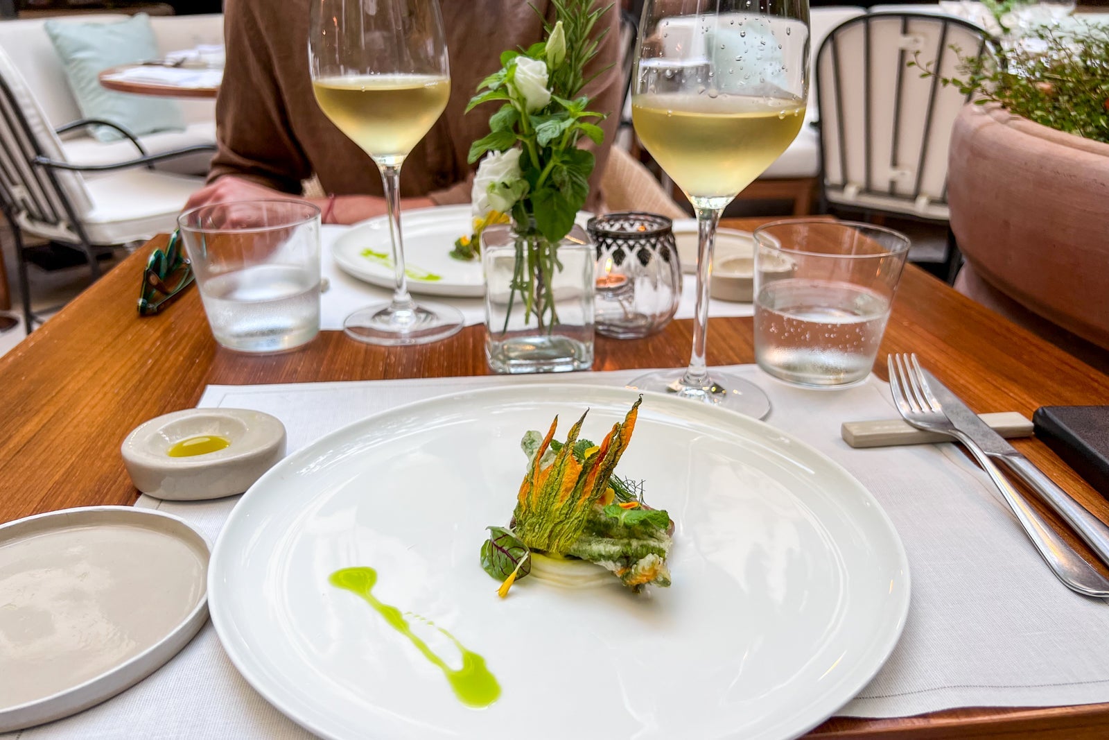 Looking to provide us with tastes and sips of Italy, our waiter started us off with glasses of 2020 Colli di Luni Vermentino (which would normally be 48 euros, or about $52, a bottle). Later, with the main course, we sipped on 2020 Alta Mora Etna Rosso (which goes for 64 euros, or $69, a bottle).