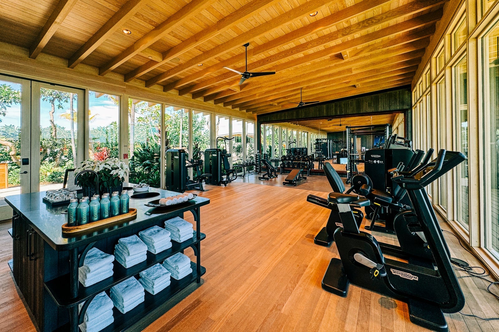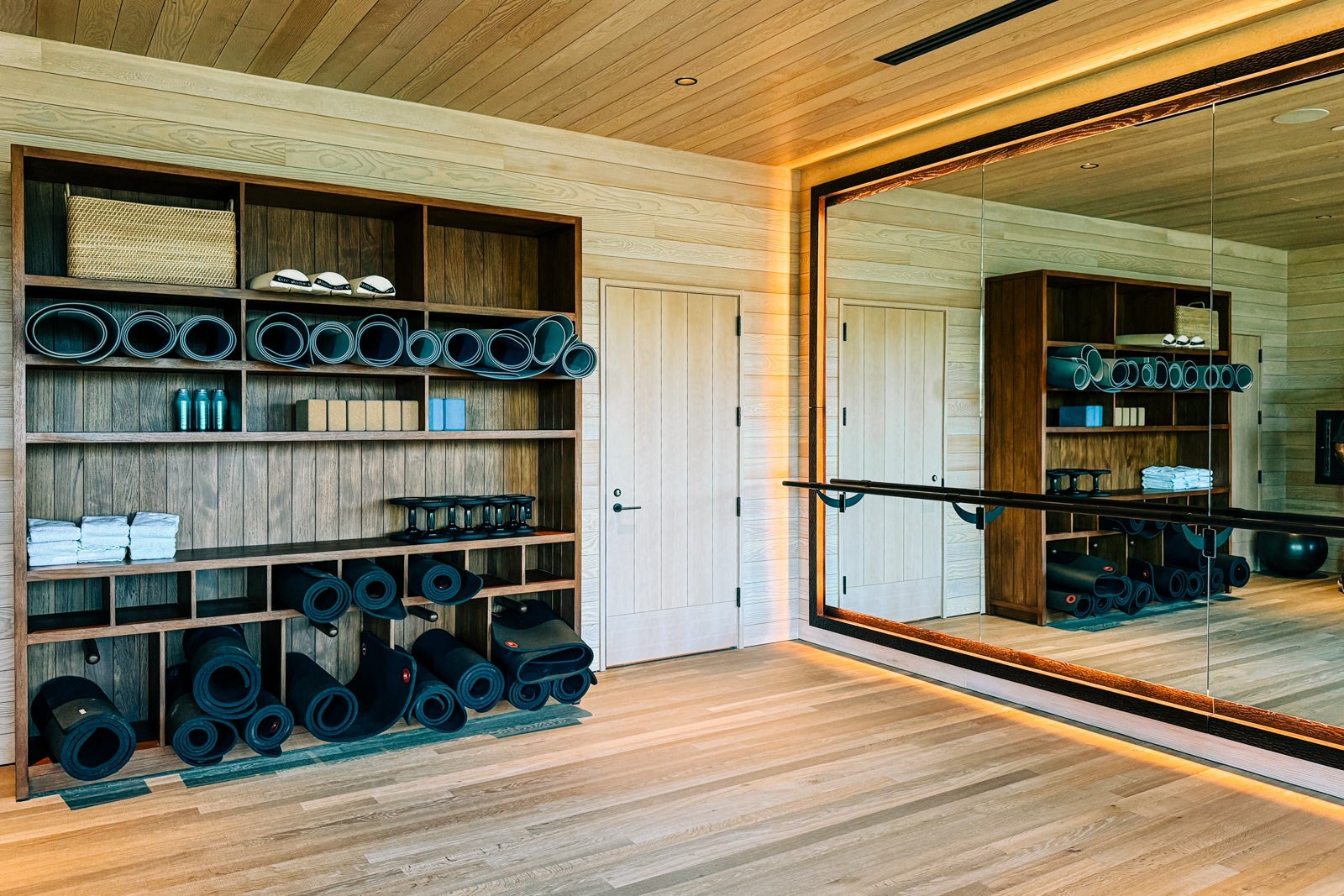 Next door to the spa, the fitness center includes a complete set of Technogym weight machines, cardio equipment like ellipticals and stationary bikes, and free weights. There's also a yoga and stretching room and an outdoor deck with more treadmills, rowing machines and Peloton bikes.
