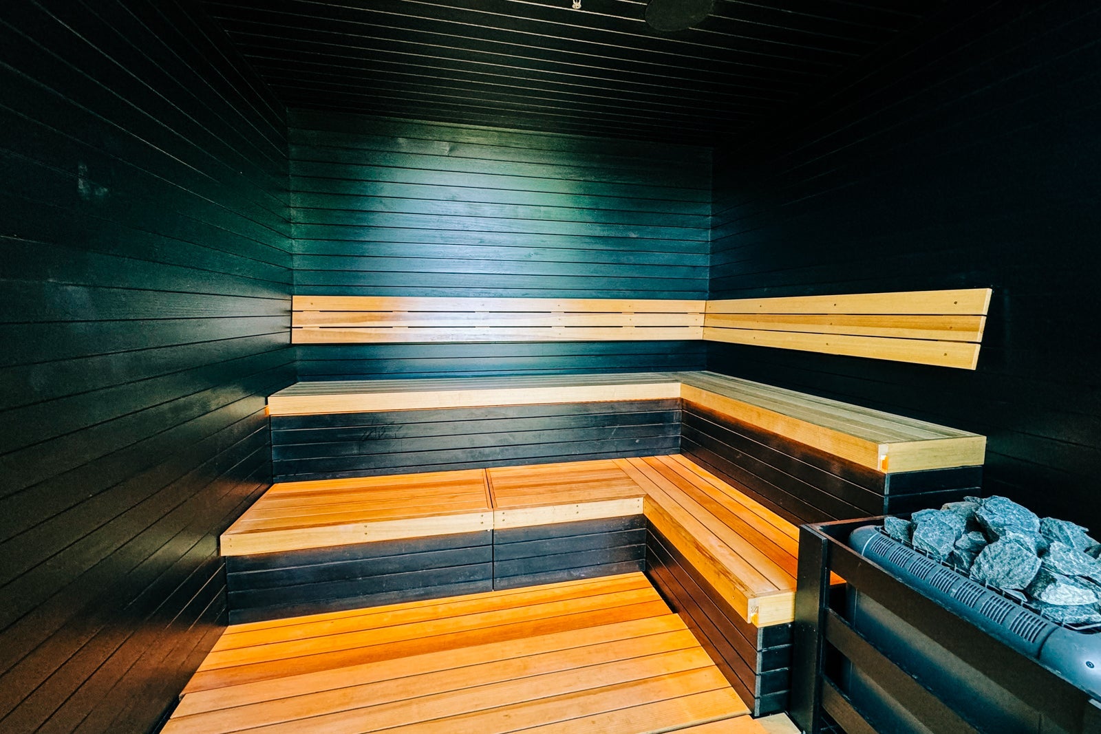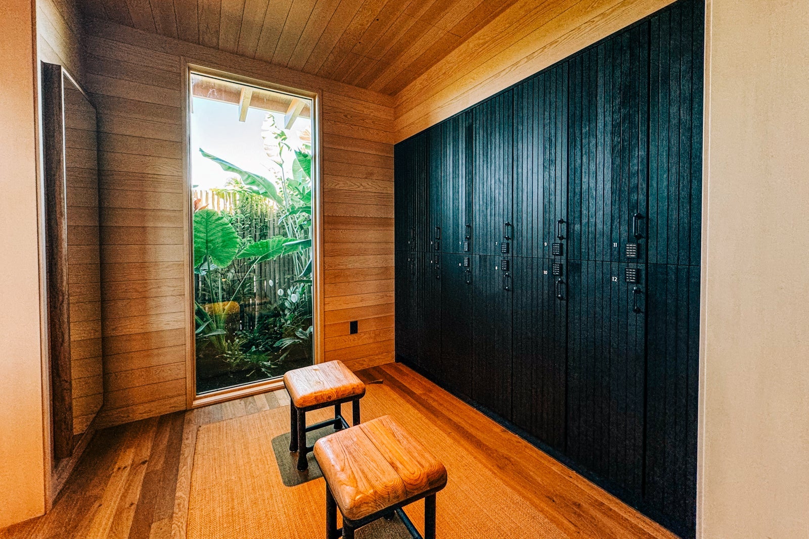 In fact, guests take a wooden walkway over the jagged rocks and past a fire spout to reach the men's and women's locker areas, which have outdoor showers and pools as well as saunas and steam rooms.