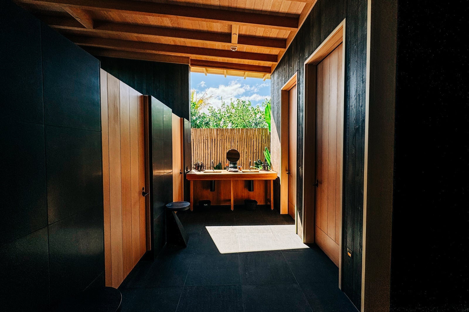 Behind this, the bathroom was a stark contrast (in a good way) to the rest of the room, with counters, floor tiles and a dramatic freestanding bathtub all made from smooth black basalt — a nod to the surrounding lava fields of Hualalai.
