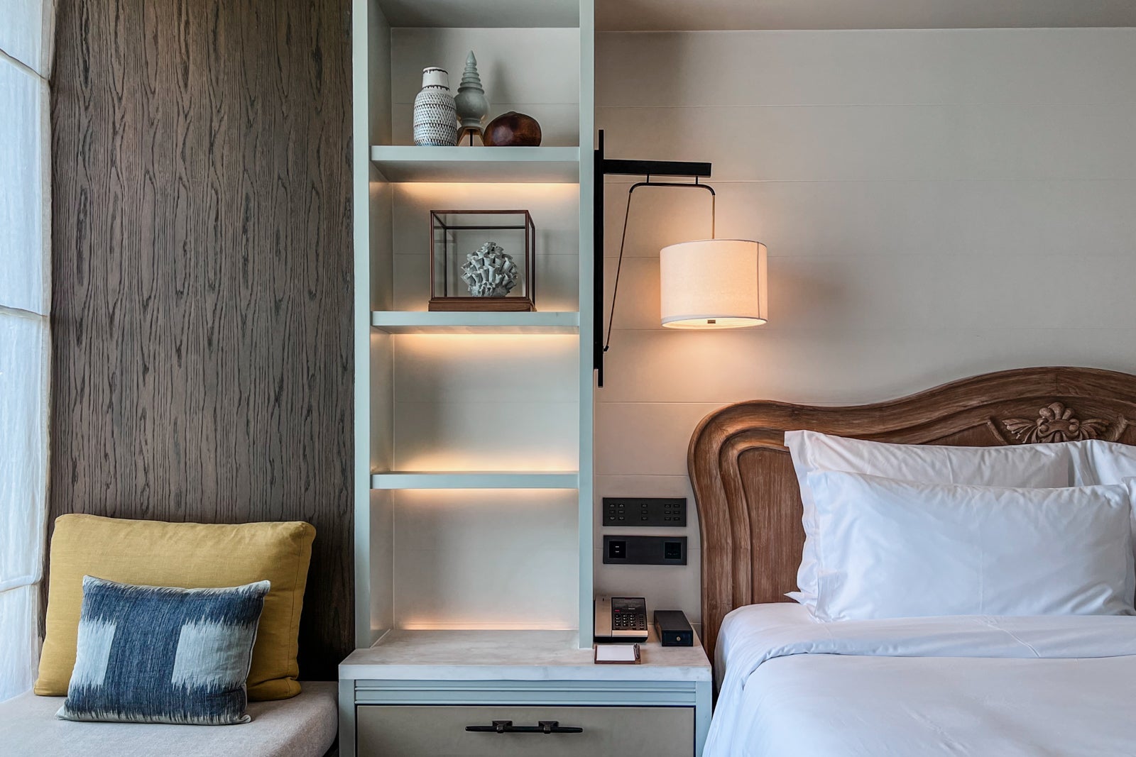 The luxe bungalow-style lodging included a tranquil design scheme of dark wood, earth tones and elegant touches like backlit, built-in bookshelves flanking the king-size bed and coffered ceilings.