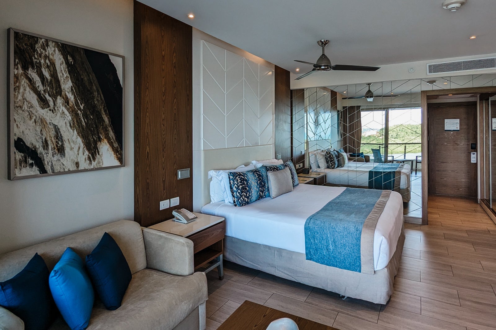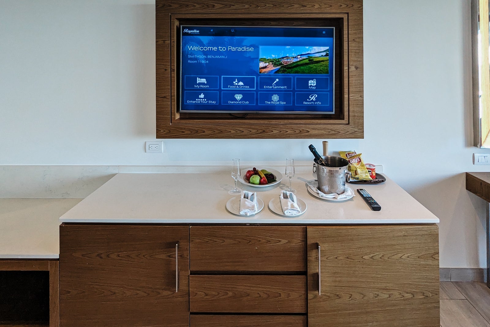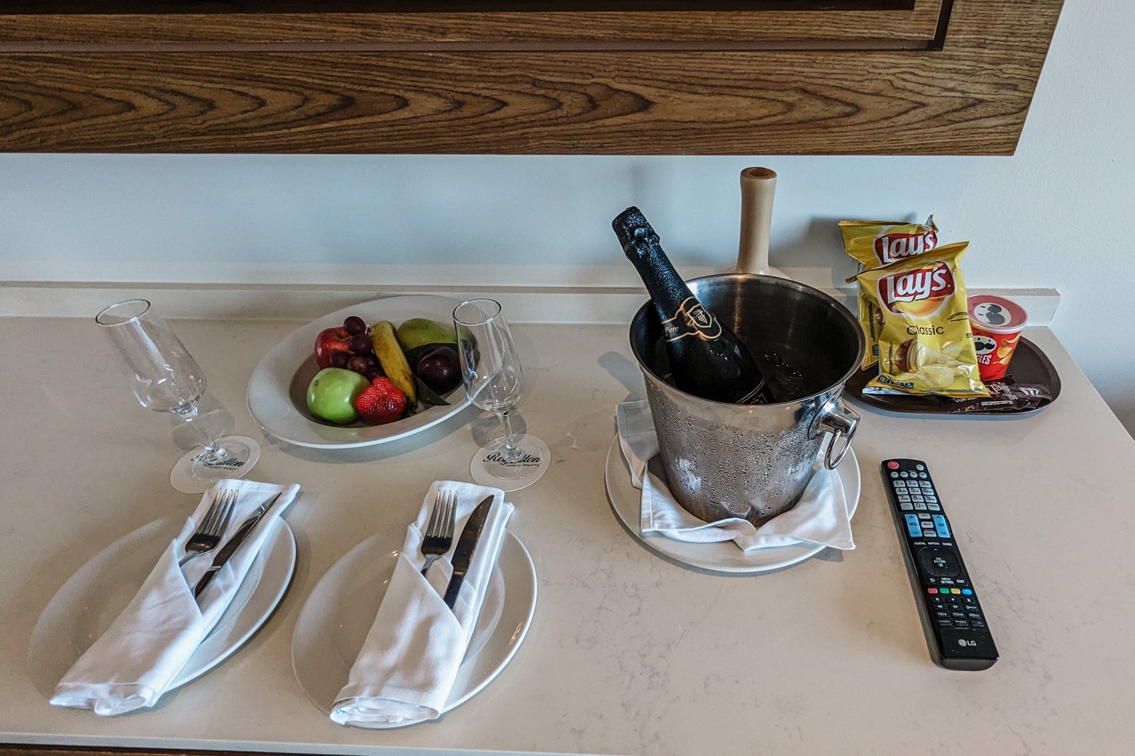 The design style was neutral and wasn't likely to win any cutting-edge design awards, but it provided a few pleasant pops of colors and nods to the local environment. Being an all-inclusive property, the minibar included local beer, soft drinks, water, chips, chocolate and a Diamond Club welcome gift of a bottle of sparkling wine and fresh fruit.