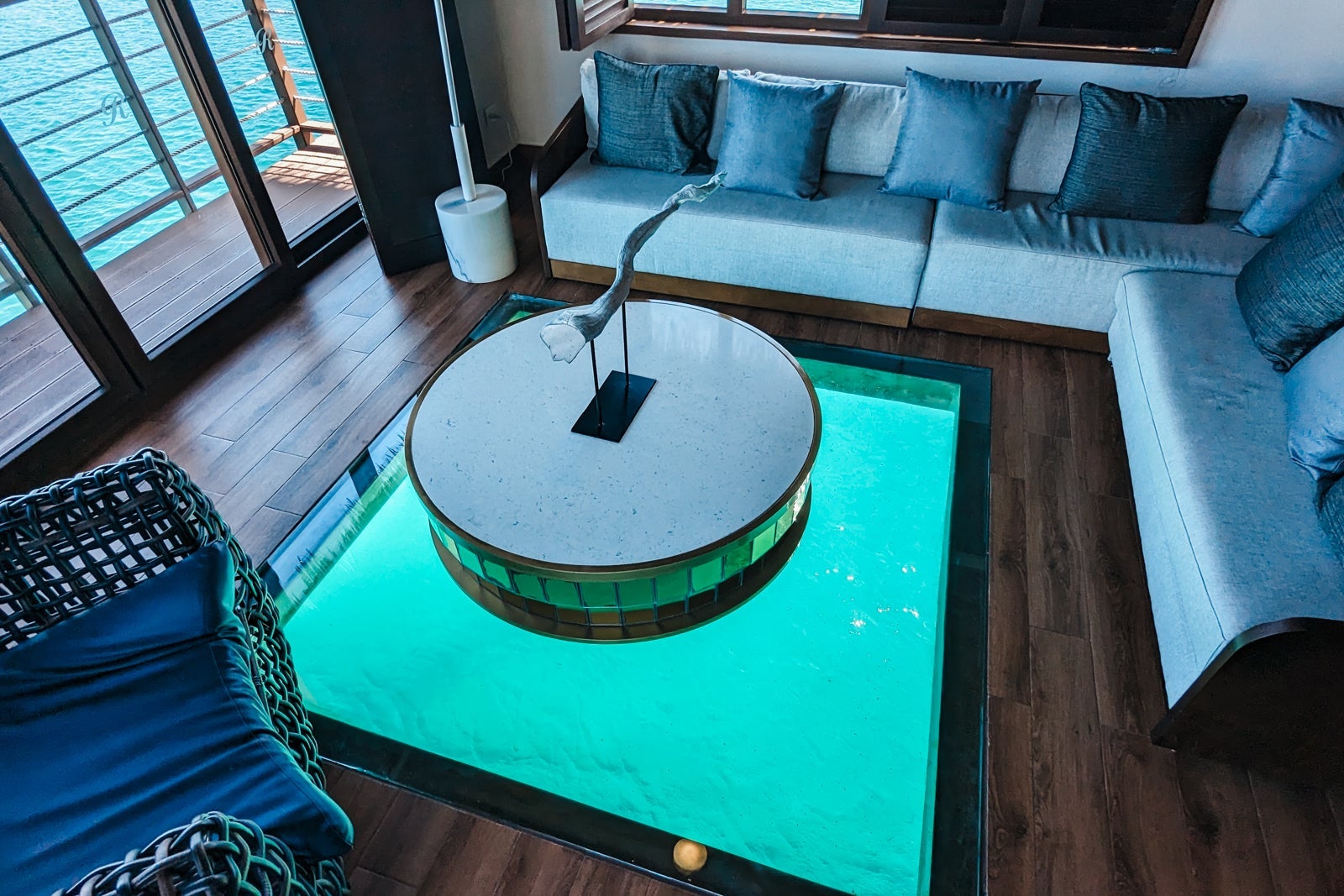 Underneath the living room coffee table was a glass floor to spot any local sea creatures coming to say hello.
