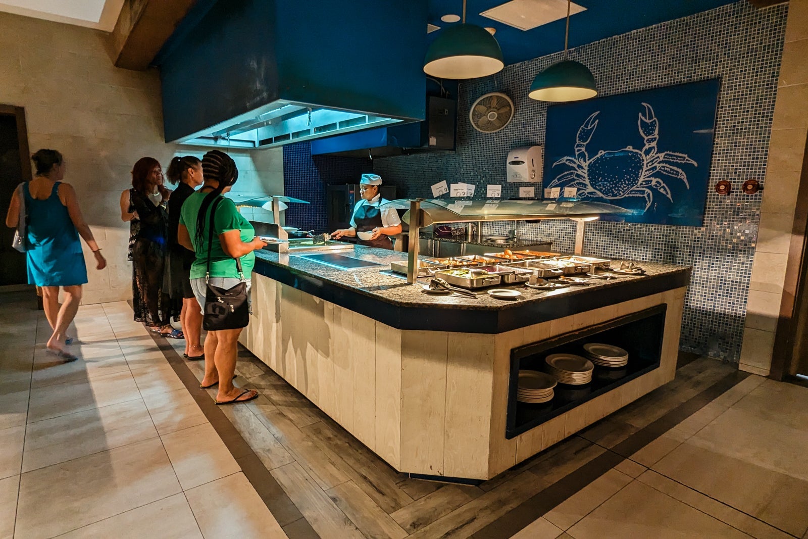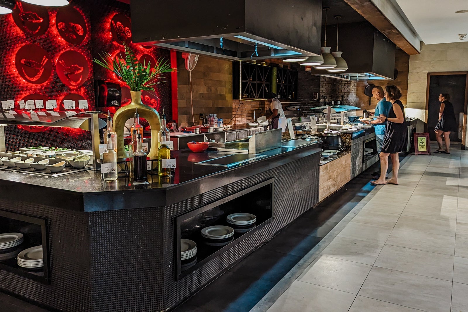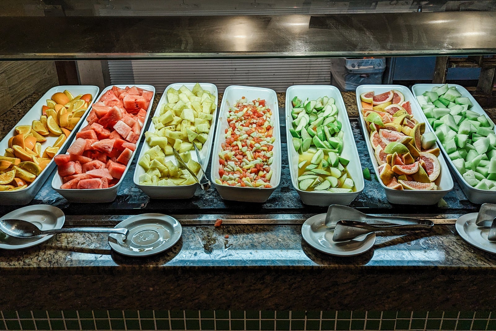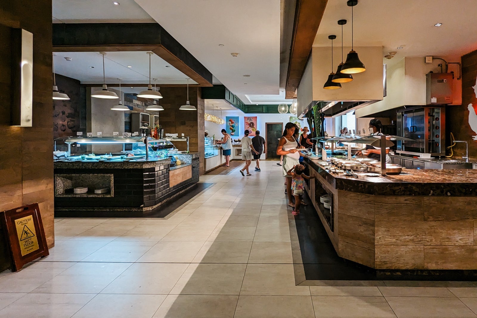 I sampled the food here for breakfast, and there were many options with plenty of American favorites like bacon, scrambled eggs, pancakes, donuts, bagels and egg stations where the friendly chefs cooked omelets to order. Everything was tasty, though not particularly high-end — given the tropical location, I hoped to see more exotic fruit options than just watermelon, pineapple and oranges.