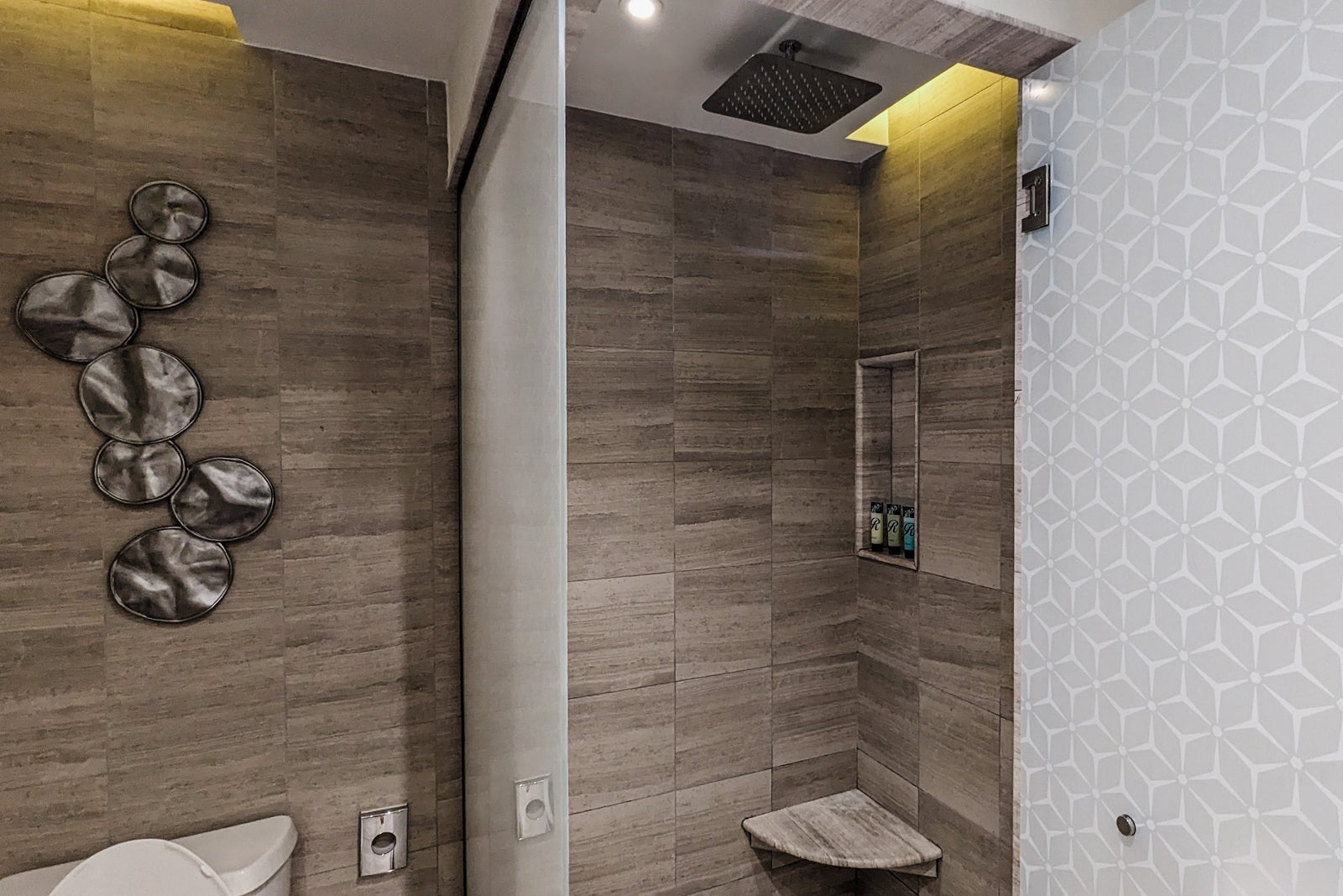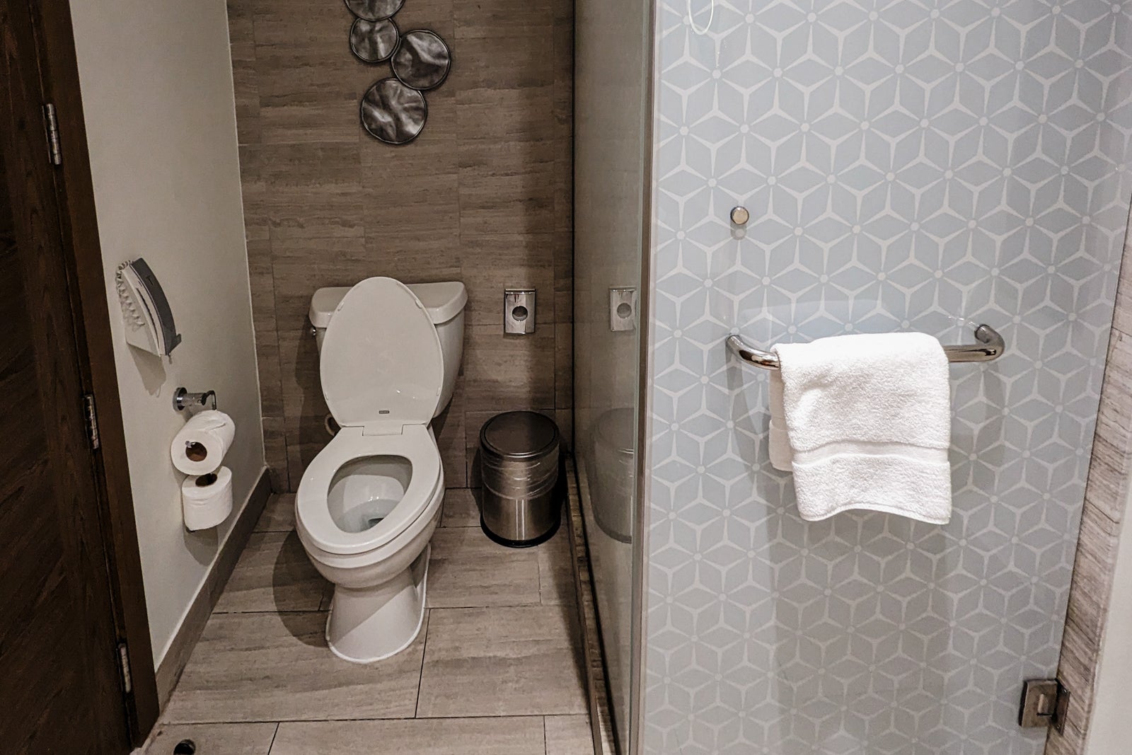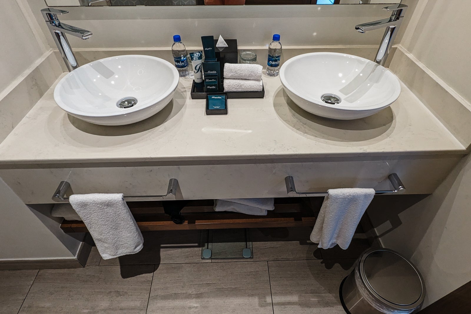 The bathroom featured a double vanity, rain head shower with excellent water pressure and temperature, and was stocked with Royalton-branded toiletries.