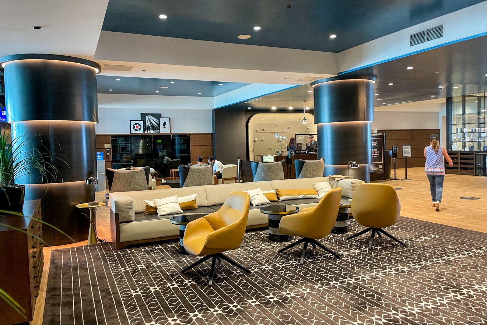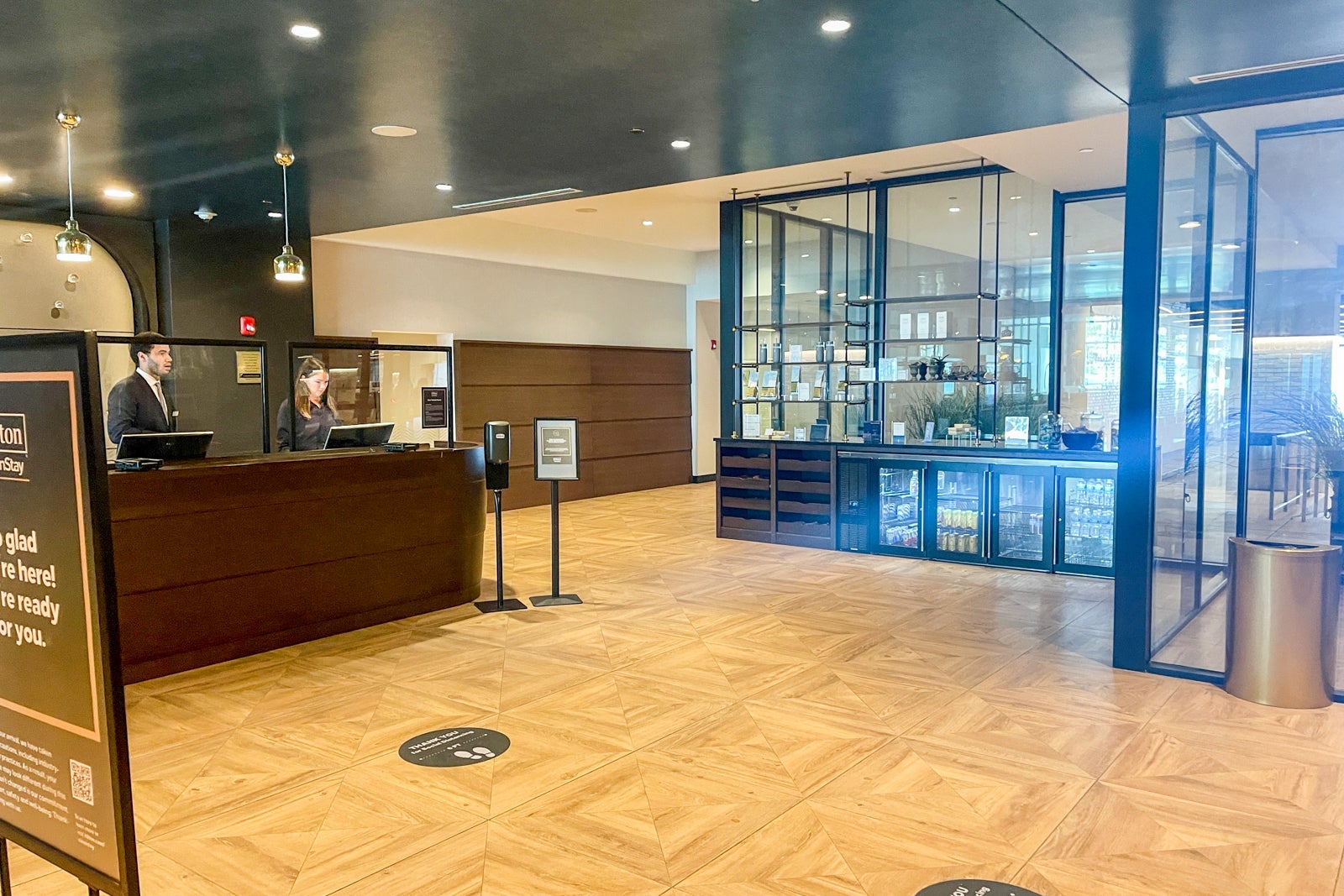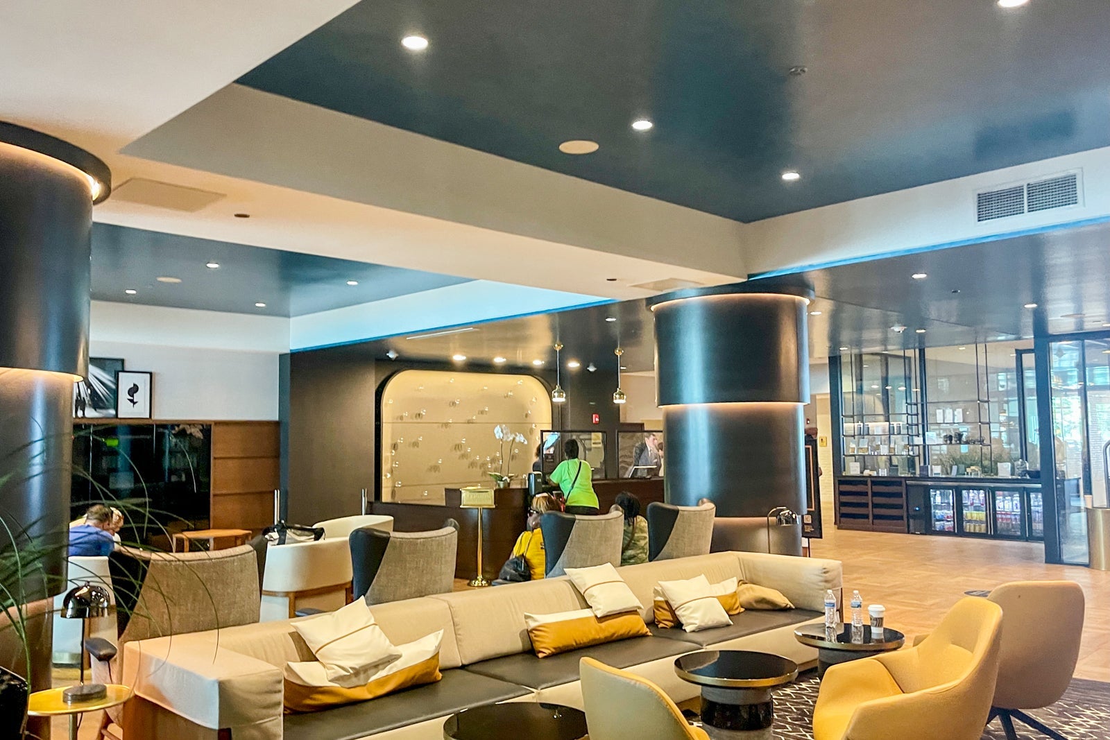 To the right of the check-in desk is a grab-and-go snack bar stocked with snacks, drinks and other essentials. You can use the dining credit included with your Hilton Honors elite status to purchase a quick breakfast or a mid-day snack.