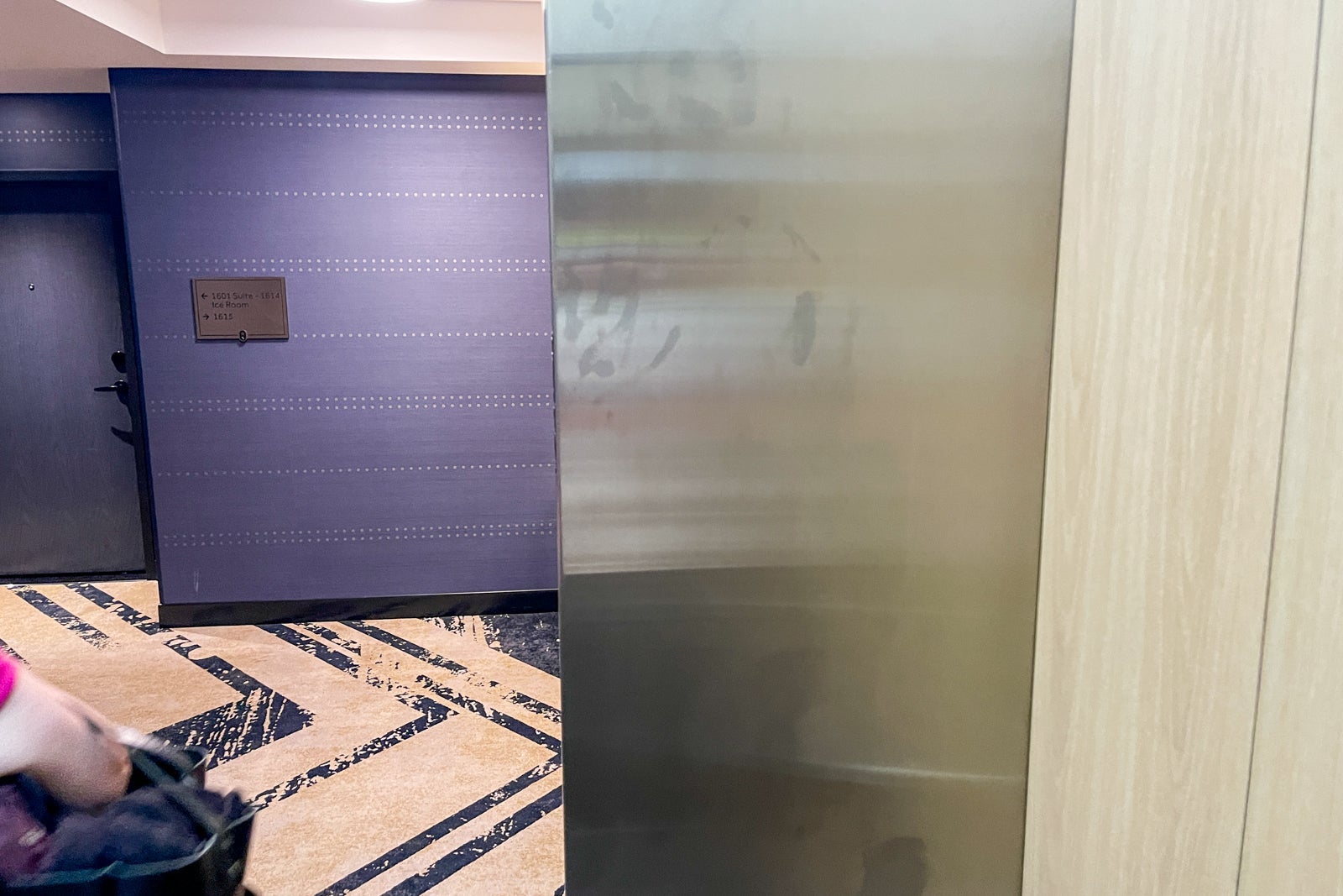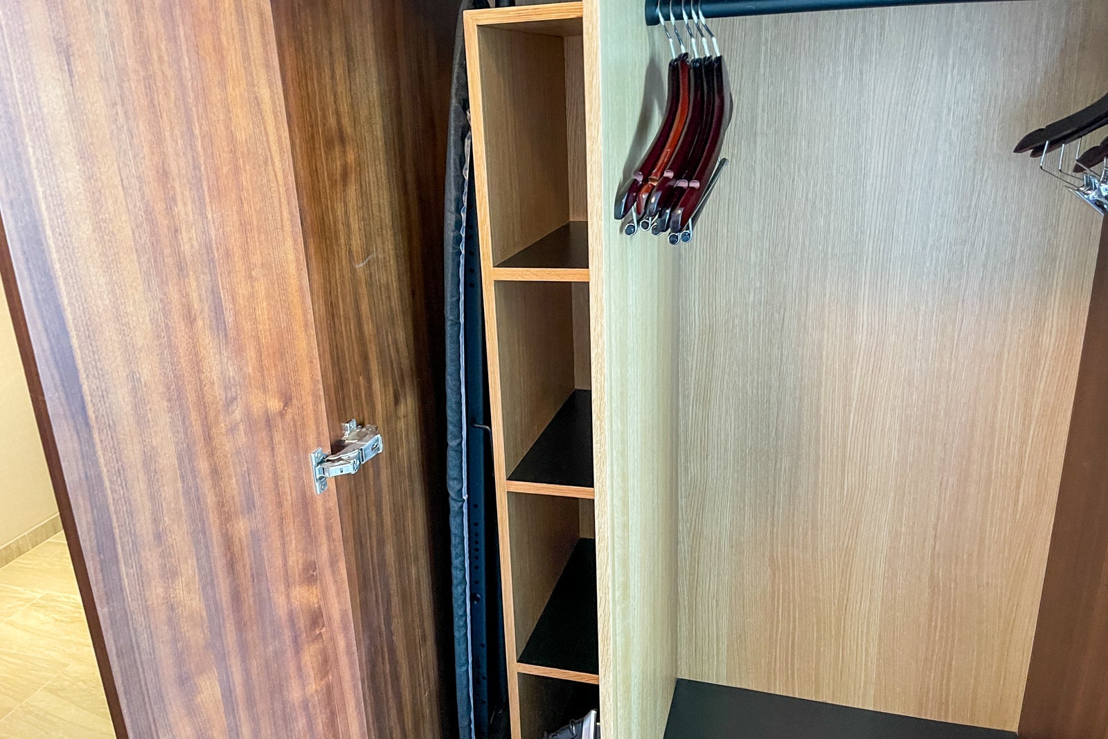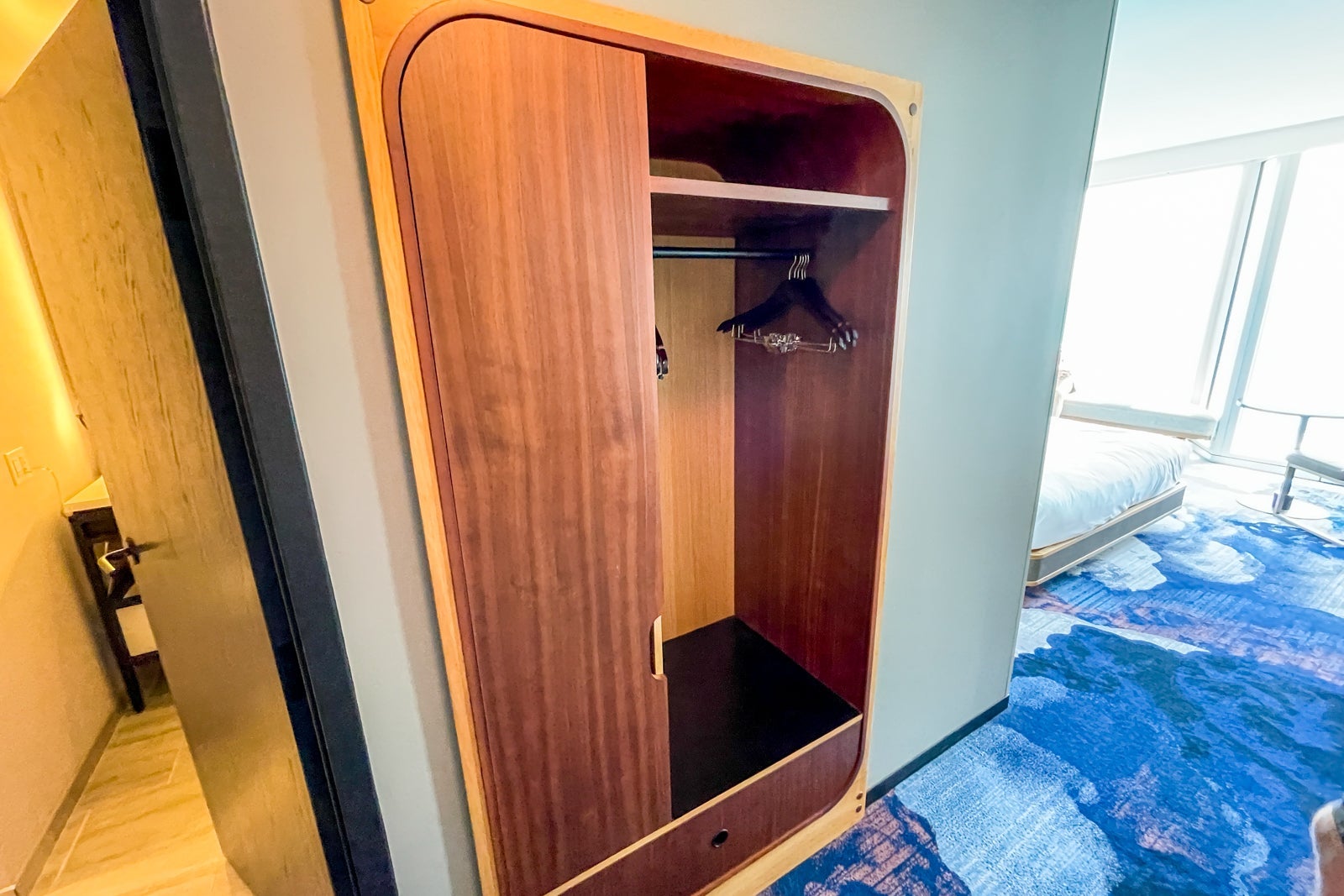 Upon entering, I was greeted with a small hallway. Here, I found a large closet with an ironing board, iron, safe and some hangers. I really liked the design — it had rounded doors which added to the modern feel of the hotel room.
