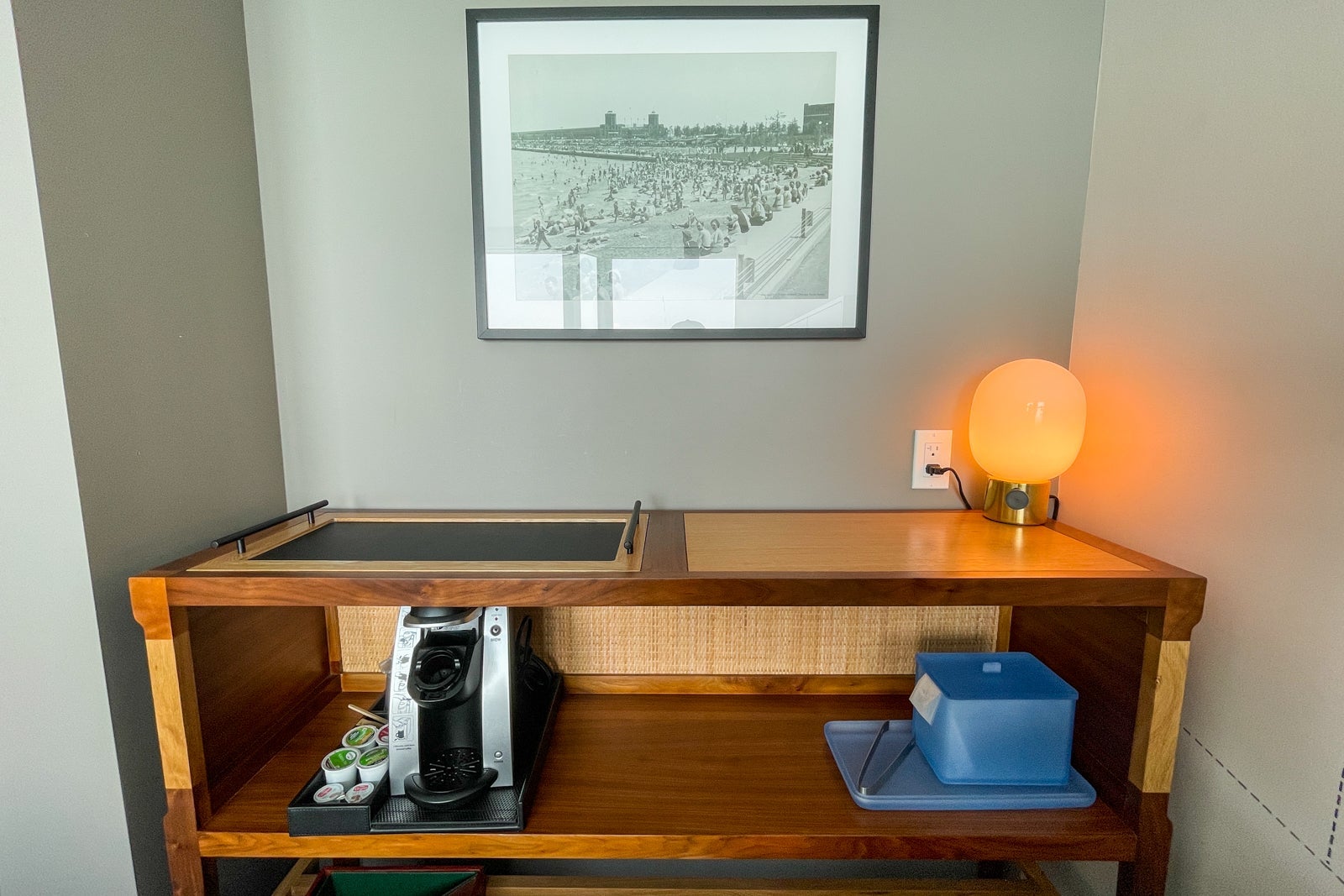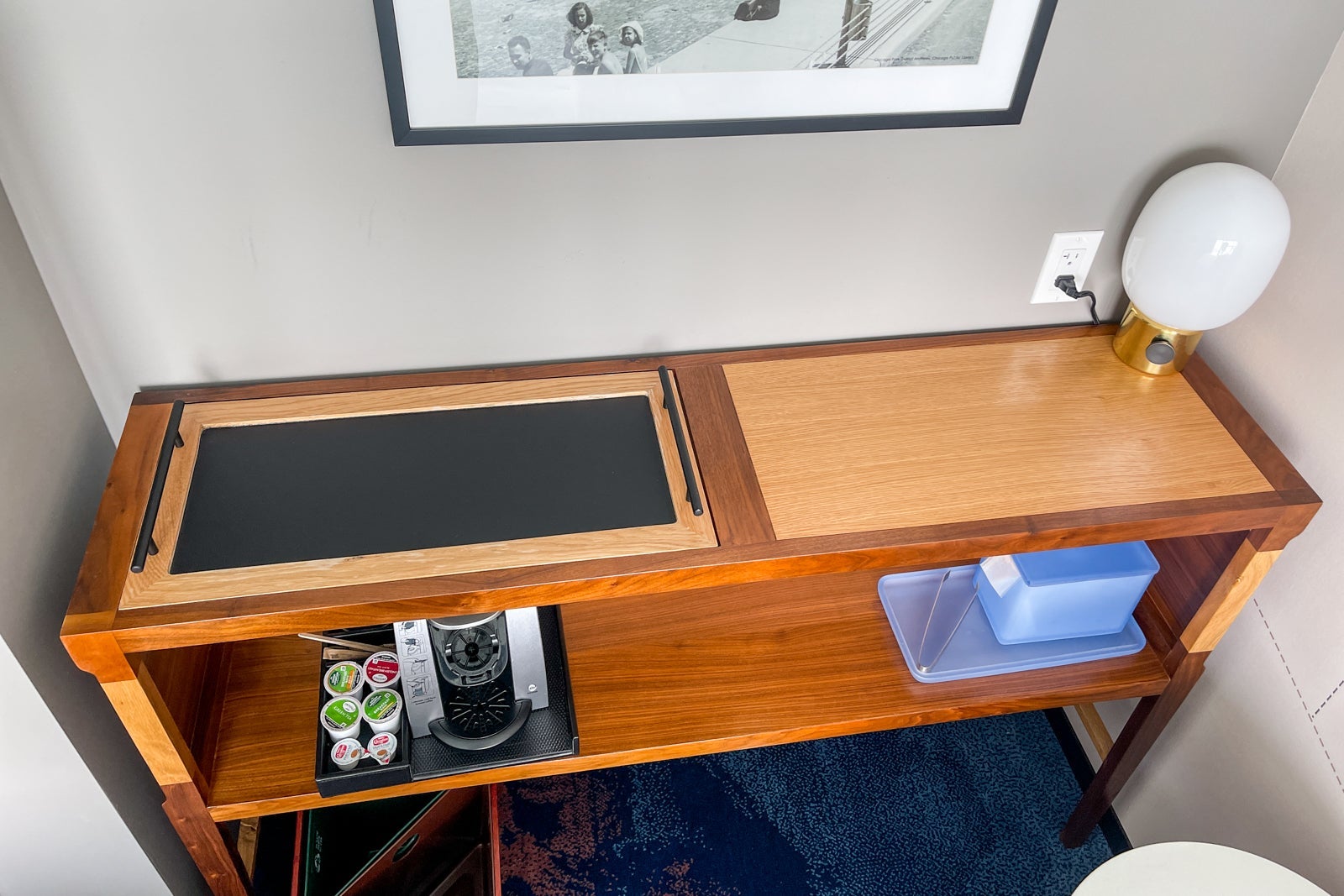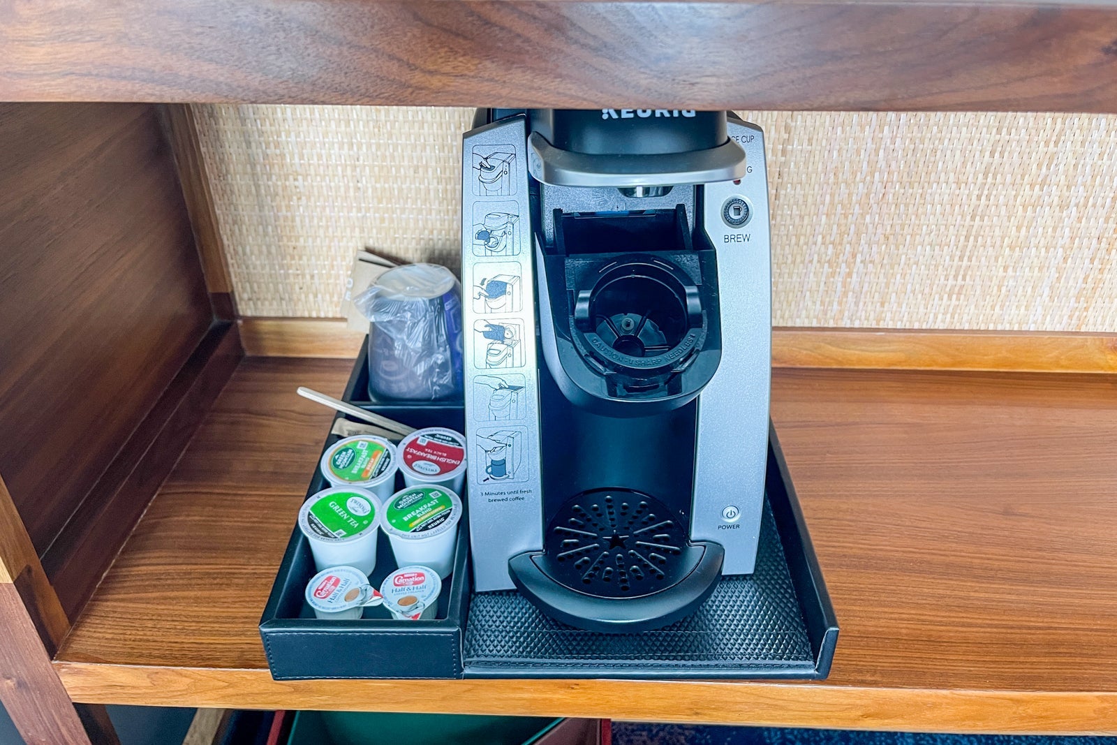 There was a small coffee bar area to the left of the bed. It housed another lamp, ice container and a Keurig coffee maker. The coffee maker was on a tray that you have to lift up and set on the counter to plug into a power outlet. It was stocked with coffee and tea pods, cups and other essentials.
