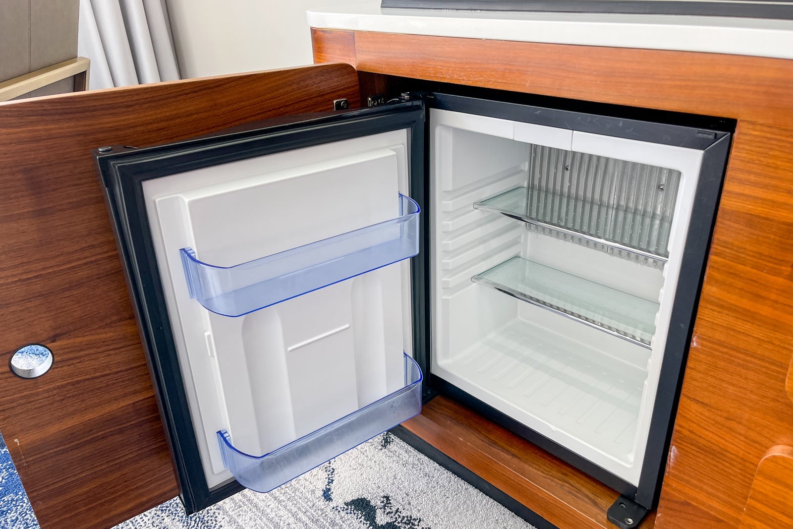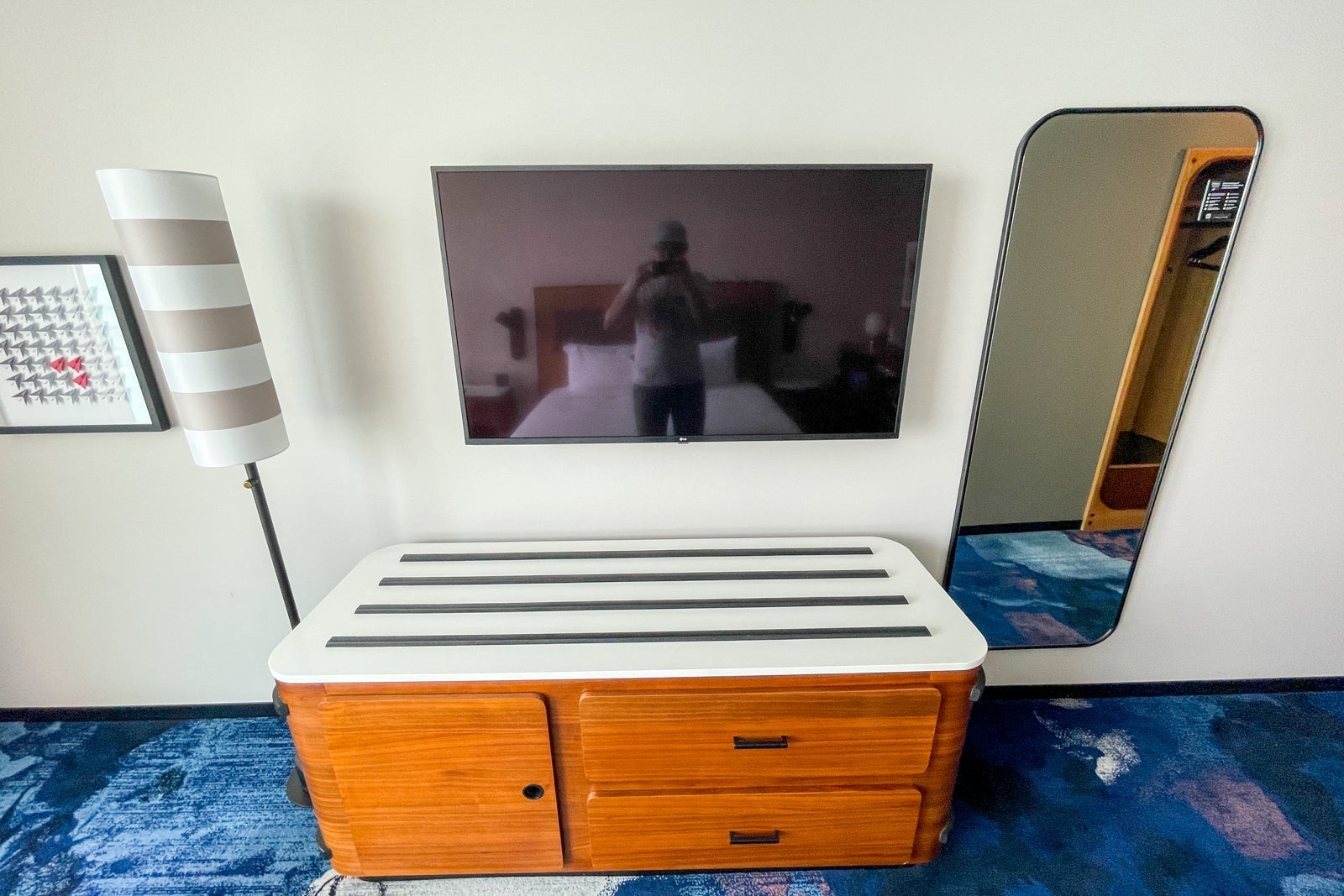 Across from the bed was a large flat-screen TV; it had a Chromecast to stream content from your phone or laptop. There was an empty mini-fridge inside the large console below the TV.