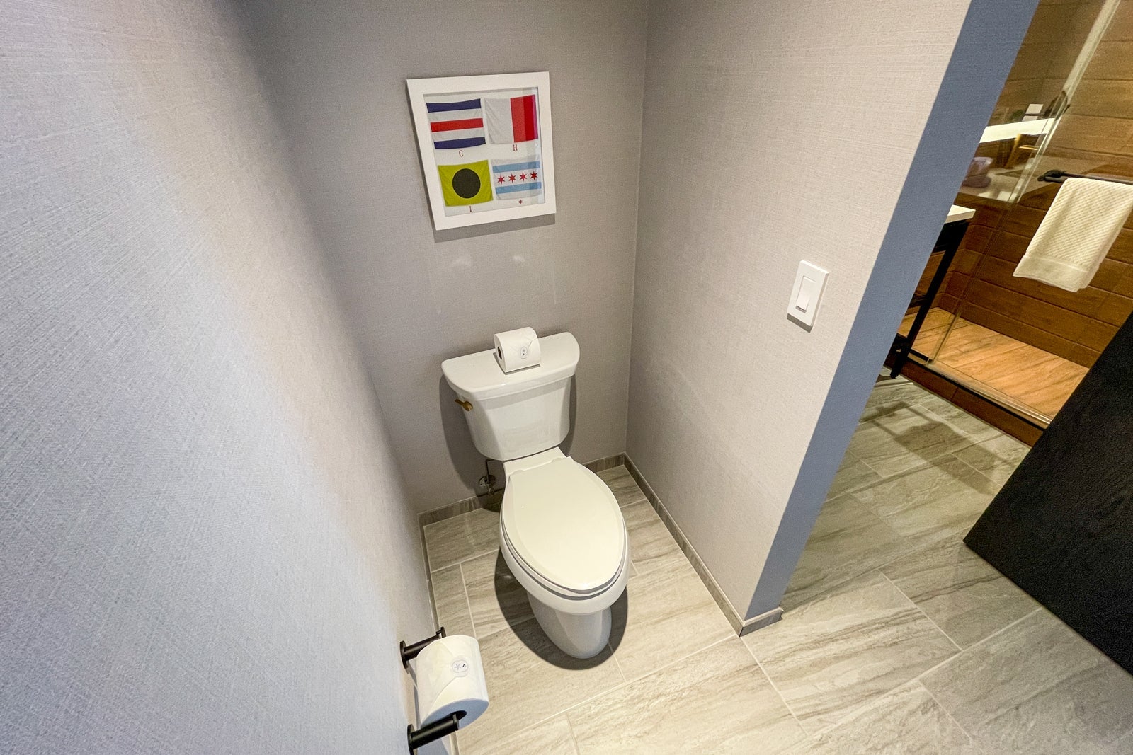 The toilet was located on the other side of the bathroom in its own enclosed space, but without a door. I really liked the Chicago flag artwork above the toilet, too.