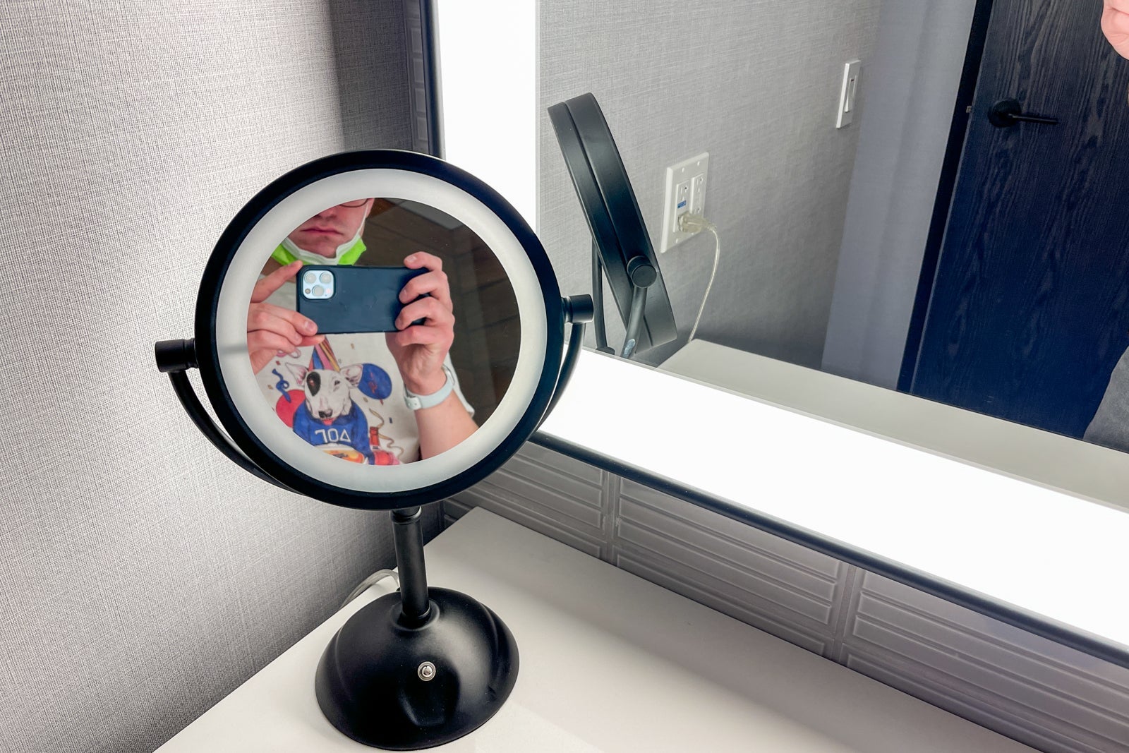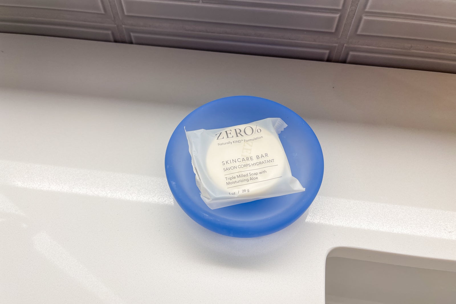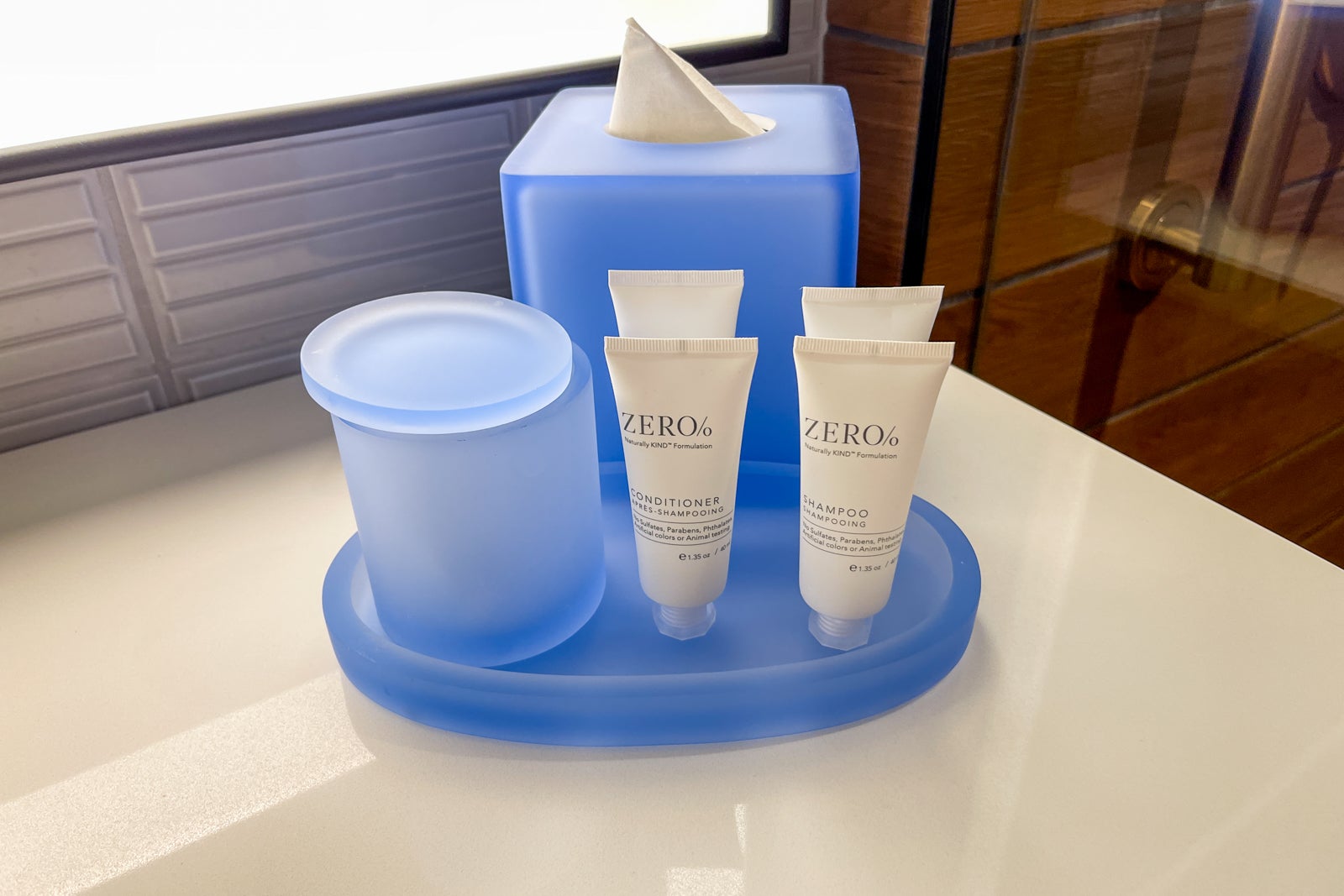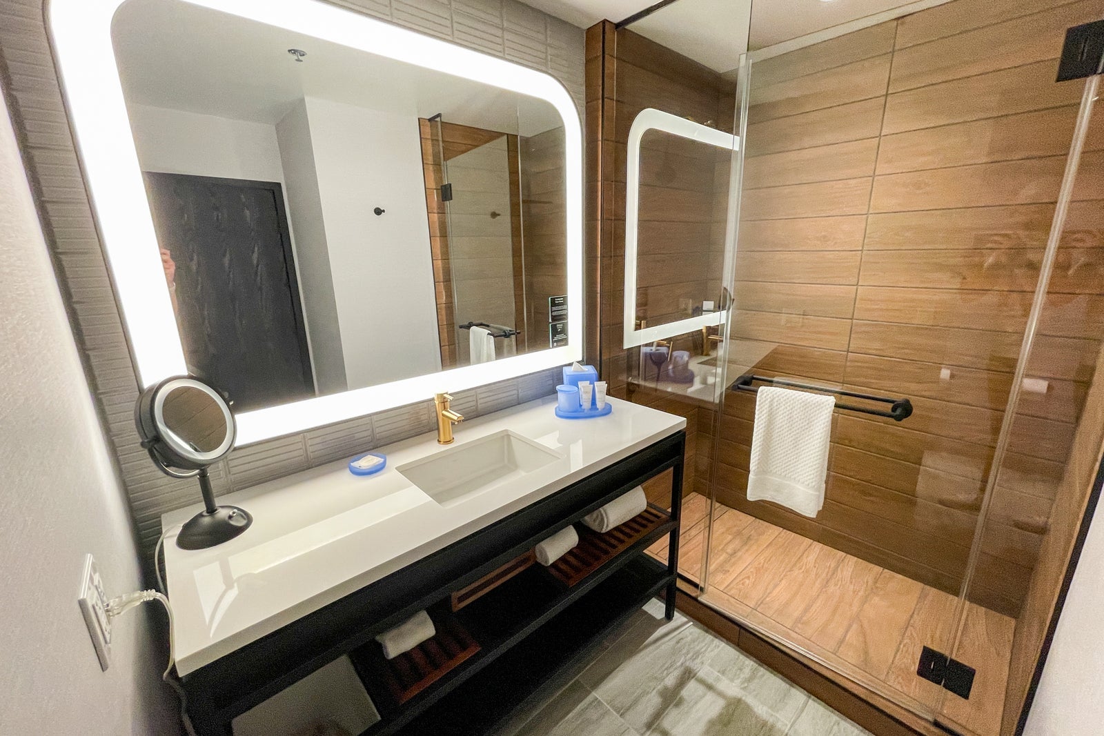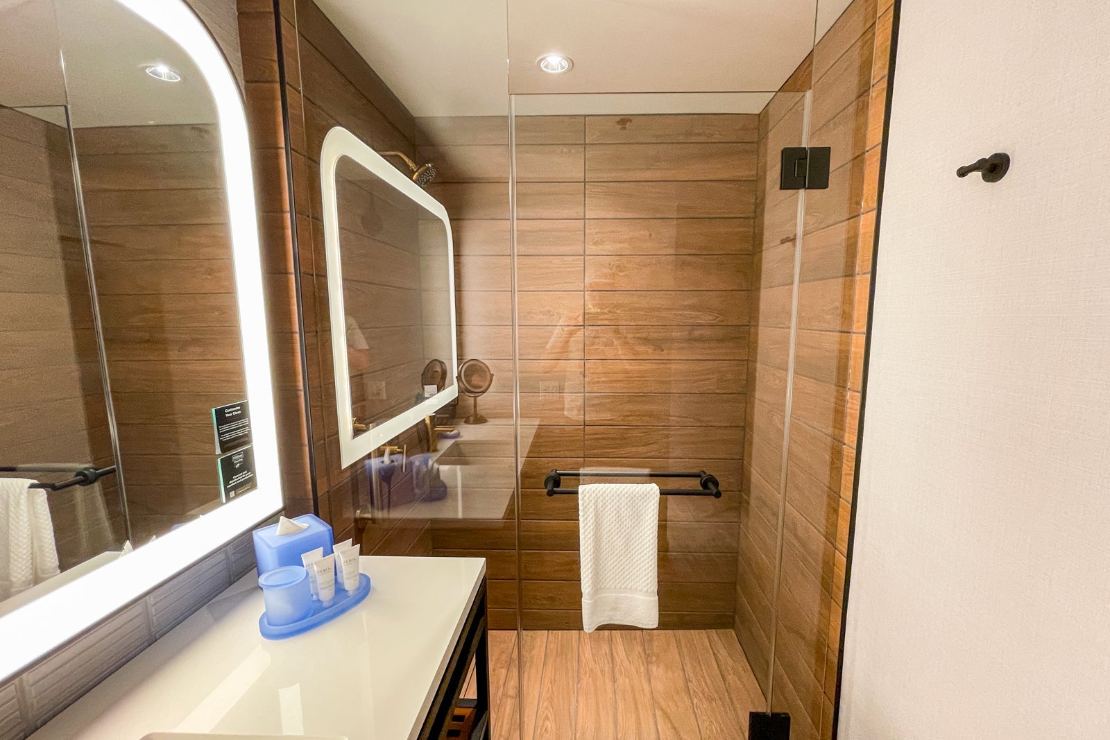 To the right of this was the bathroom, and it was excellent. You're greeted with a large vanity when you enter the bathroom. It was outfitted with single-use toiletries, a mirror and a small makeup mirror. I'm a huge fan of the vanity's rounded design that continued throughout the room.