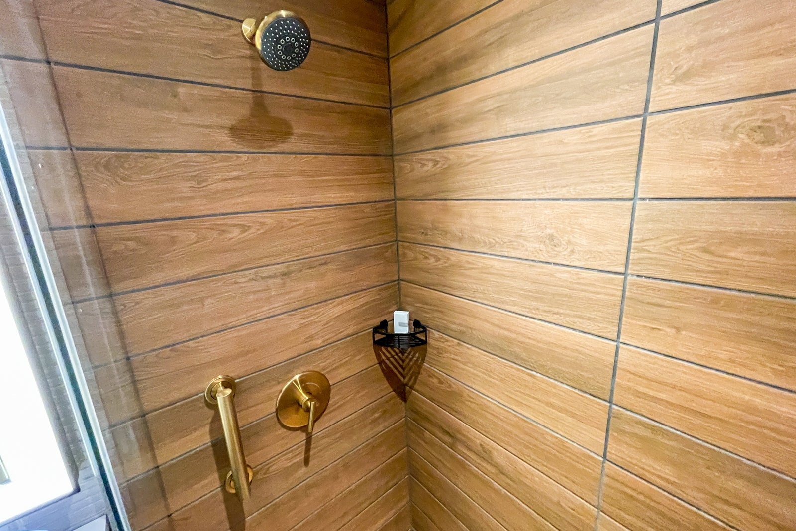 The shower was to the right of the sink and also well-designed. The enclosed shower room was large and it had a very beach-inspired design, with light wooden floors and gold accents.