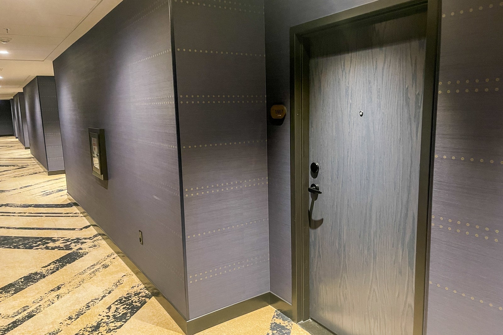 When I got off the elevator, I was surprised to see that the hallways were completely finished and looked quite modern. The hallways are painted a dark blue which contrasts nicely with the blue and yellow carpets. It's worth noting that the rooms were not sealed with Hilton's usual CleanStay seal.