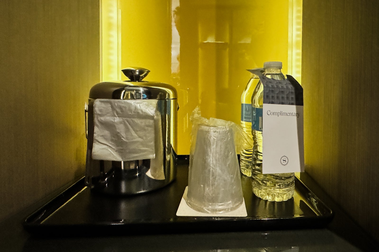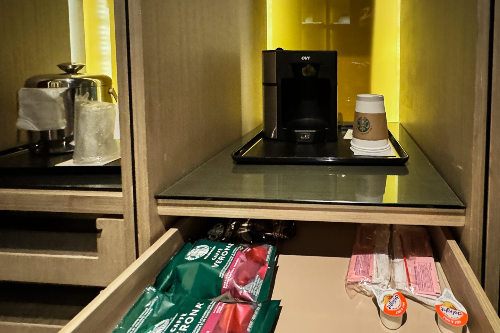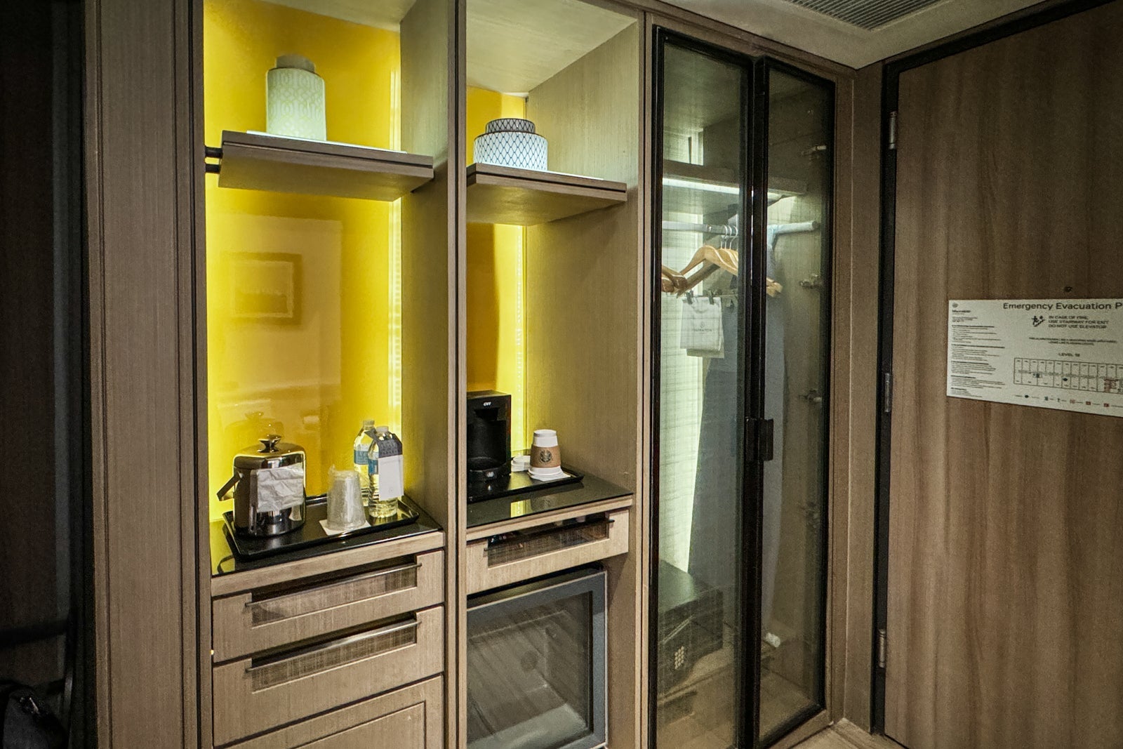 Upon entering the room, there was a closet with a safe, iron and ironing board. Next to that was a minifridge and tea and coffee maker, an ice bucket and two complimentary glasses of water.