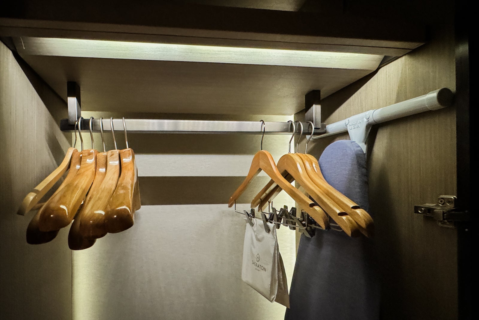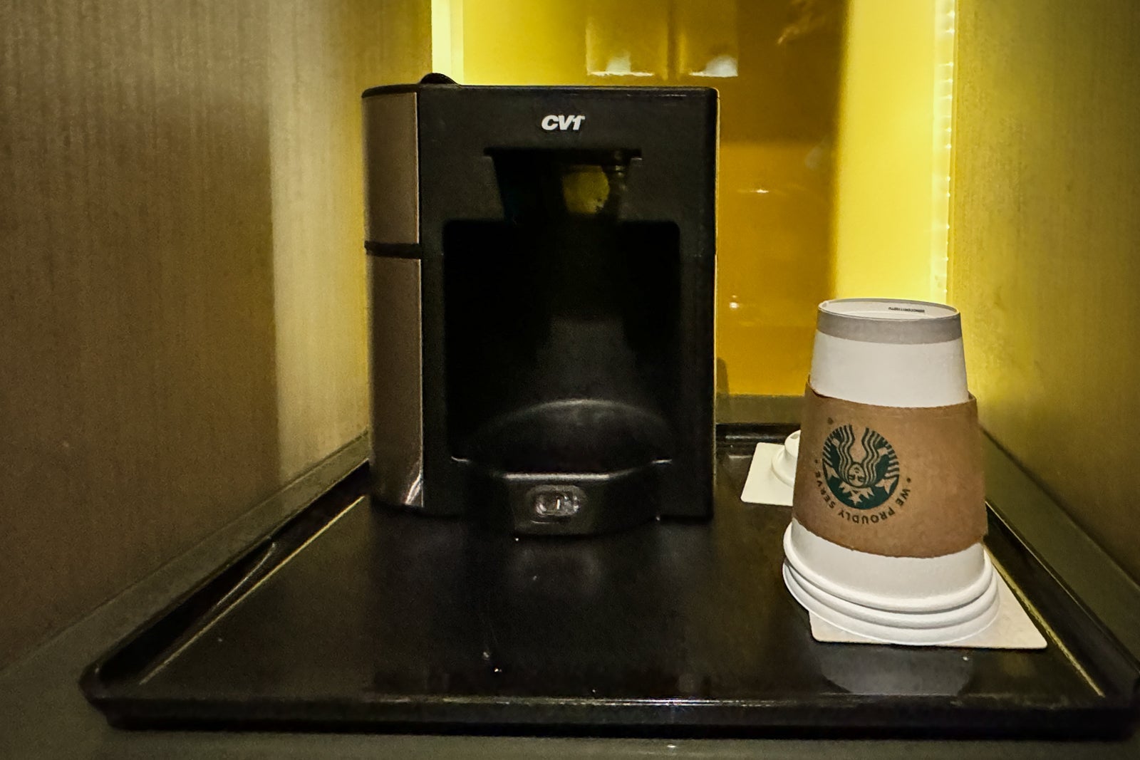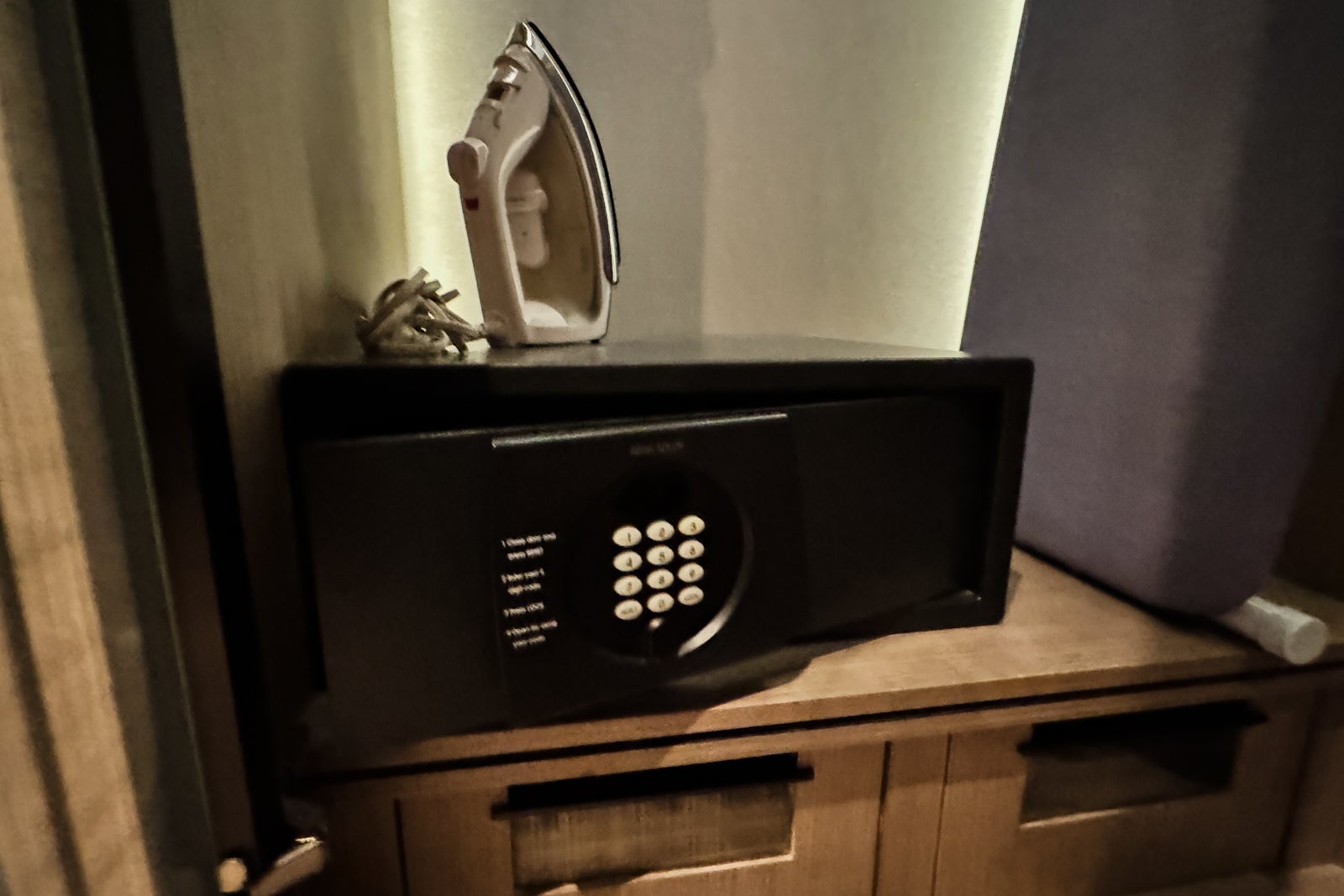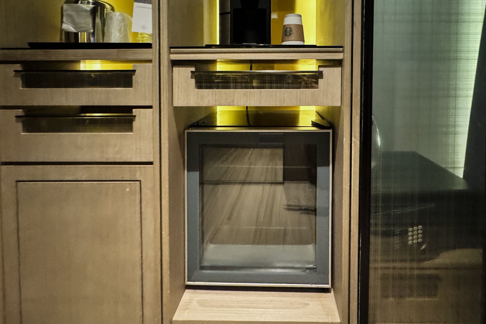 Upon entering the room, there was a closet with a safe, iron and ironing board. Next to that was a minifridge and tea and coffee maker, an ice bucket and two complimentary glasses of water.