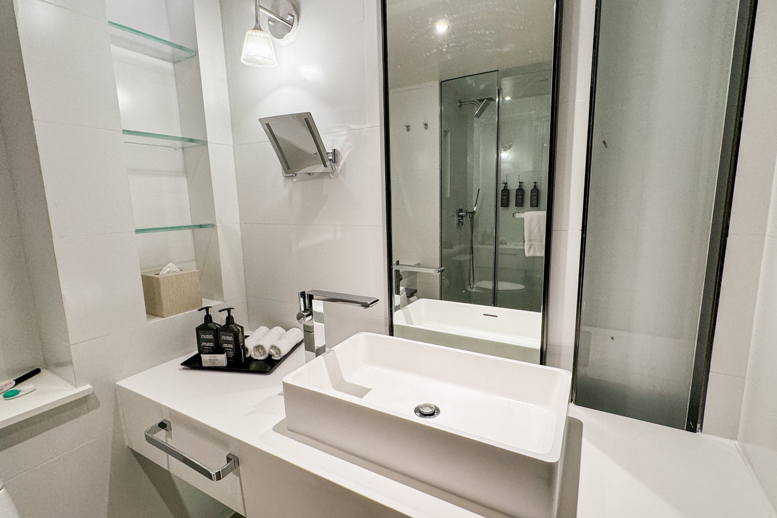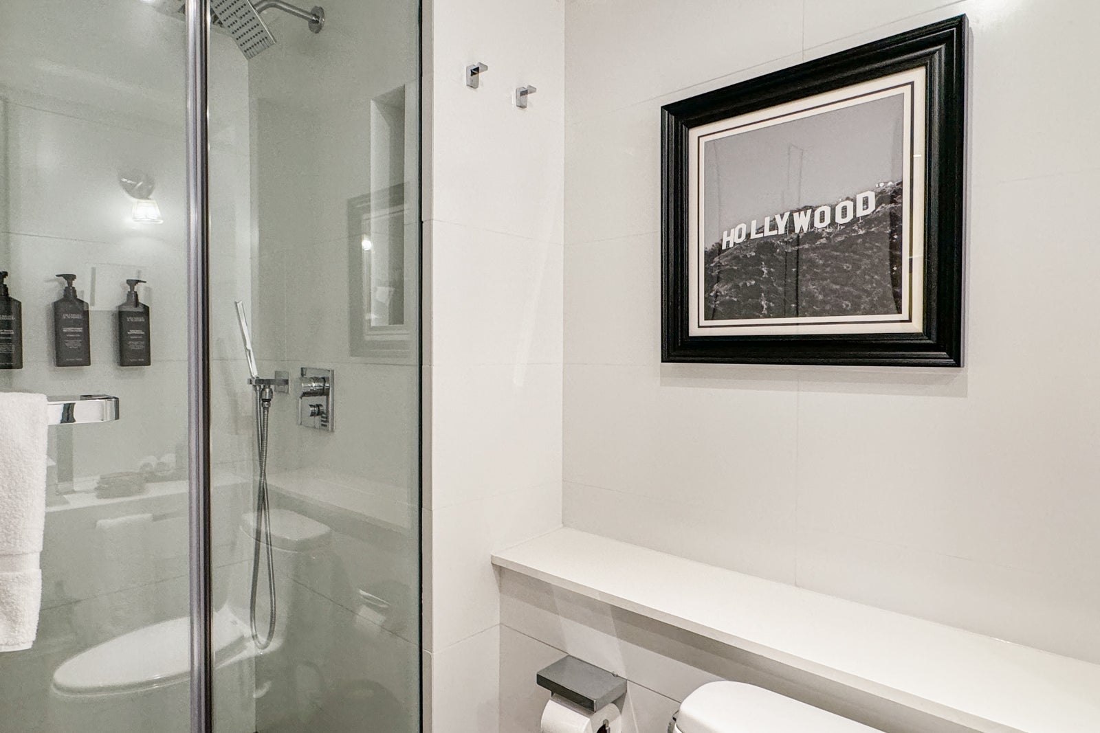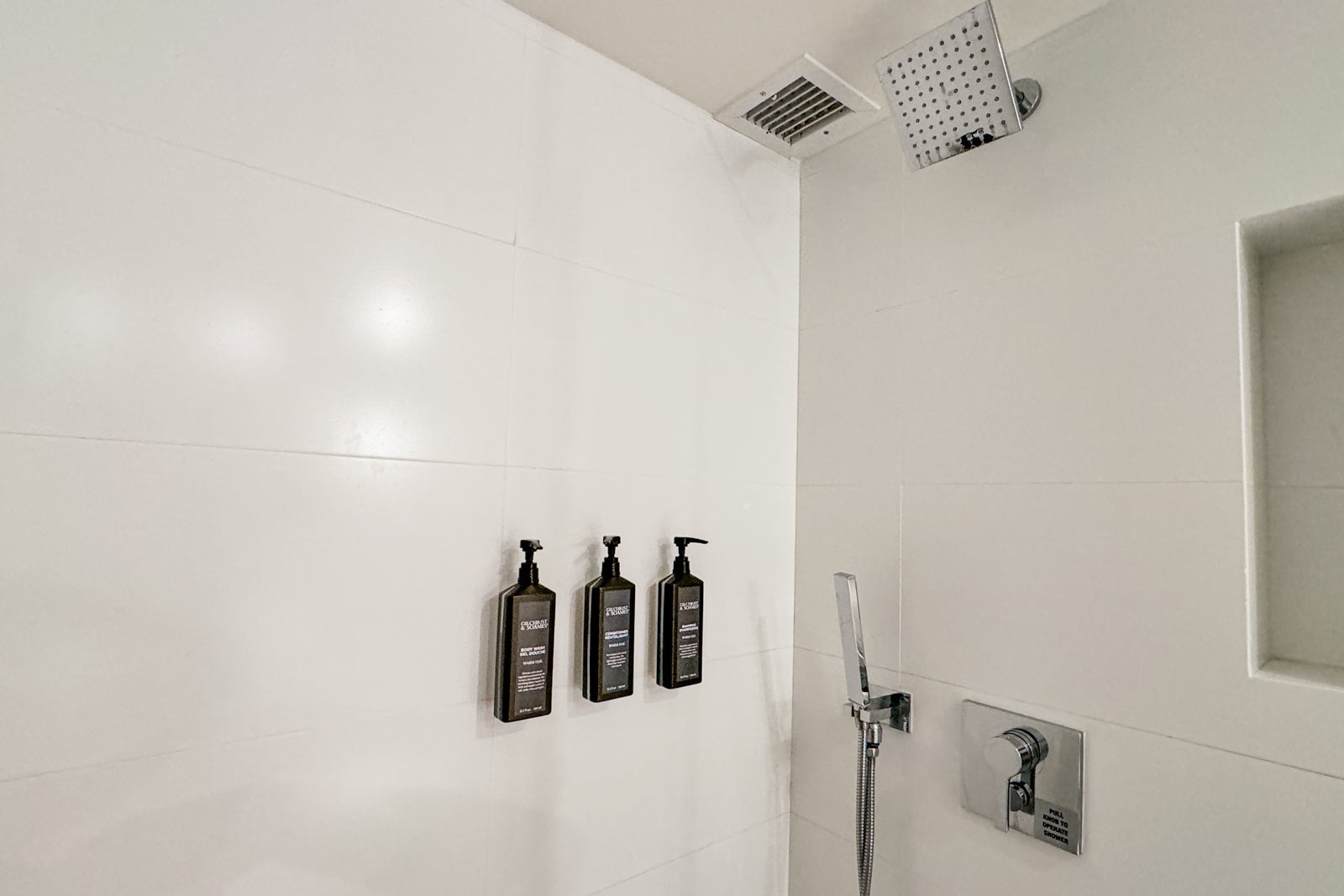 The bathroom was bright and clean, with refillable "Warm Oak" Gilchrist & Soames products in the shower. There were refillable hand soap and lotion bottles in the same scent near the sink and a hairdryer as well. With a wide countertop and several shelves, I was much more impressed with the storage space in the bathroom than the bedroom.