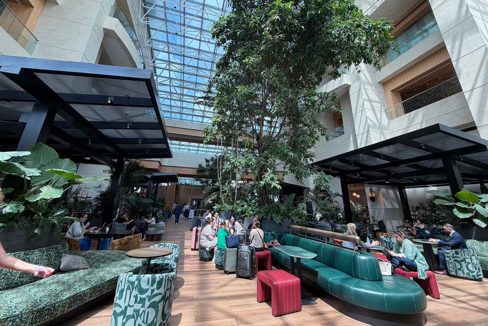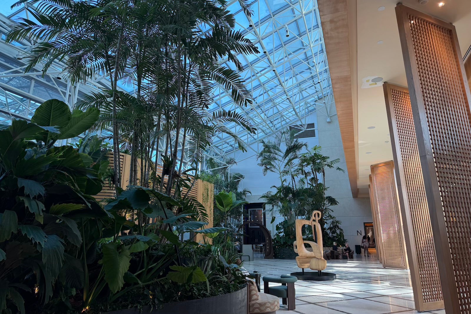 The atrium-style lobby is full of greenery, with seating that matches the earthy, cool tones of the plants and ocean vibes. Plentiful pieces of art added an overall feeling of cool to the entire space.