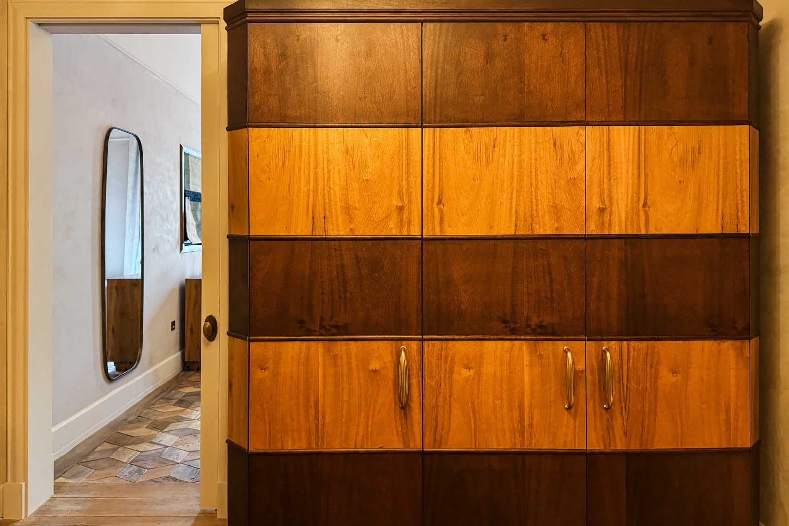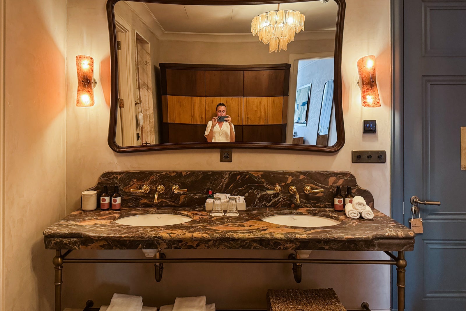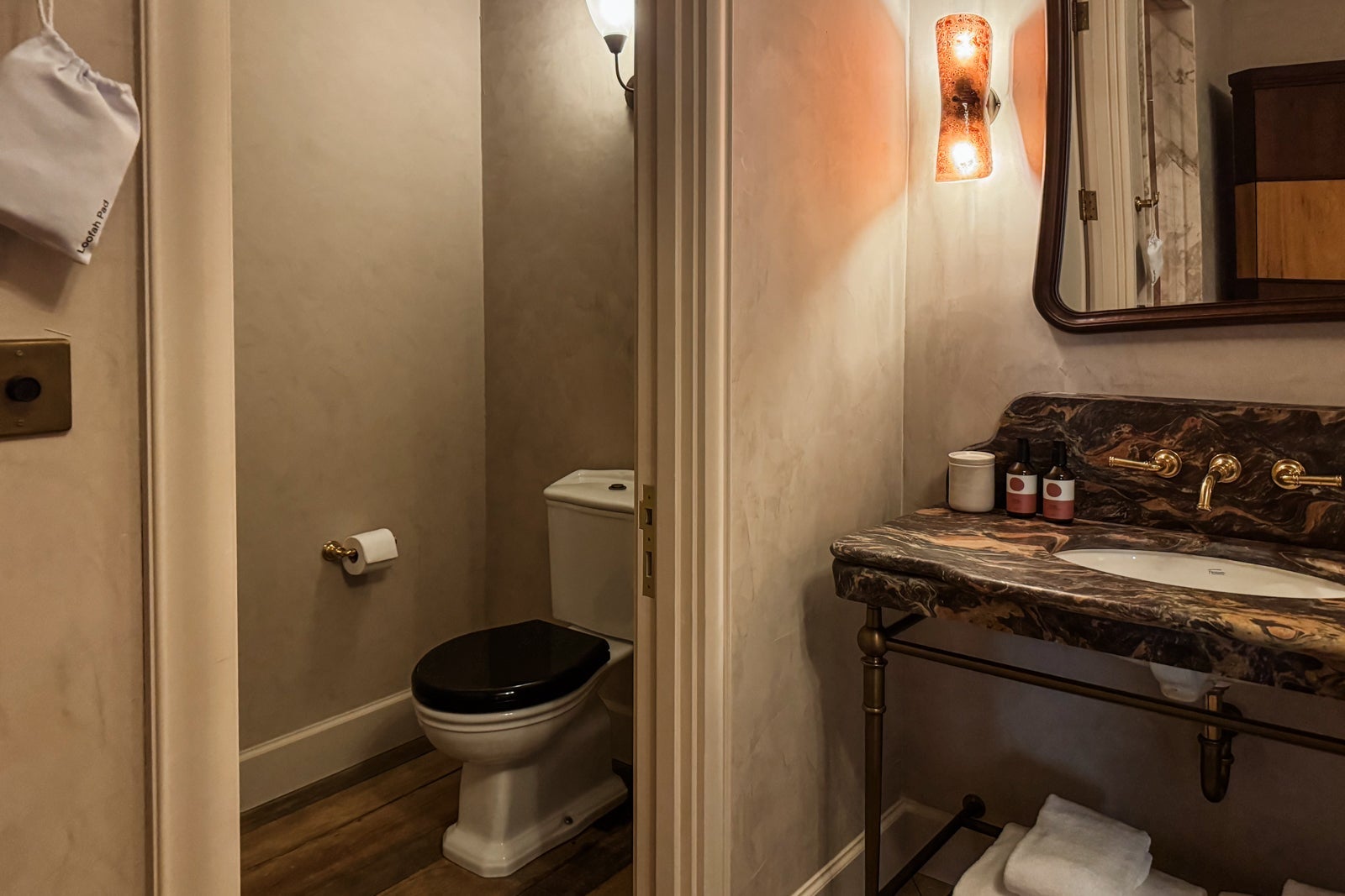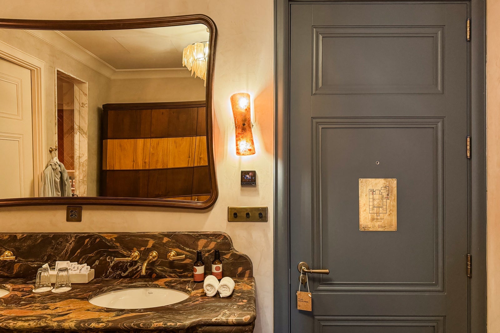 When I entered my Big room through the front door, I came in through the bathroom (perhaps an unexpected entry point, but it provided a good incentive for slipping into a comfy bathrobe immediately). The space was moodily lit and large, with standout features like a two-tone wooden wardrobe, marble countertops and artsy wall sconces.