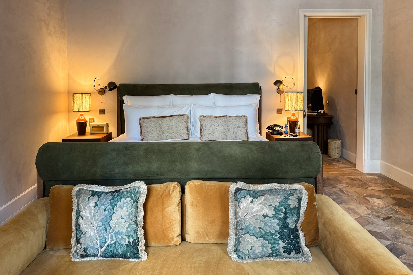 Beyond the bed was a bold velvet couch overlooking the two enormous wooden doors that led to a terrace overlooking the street below.