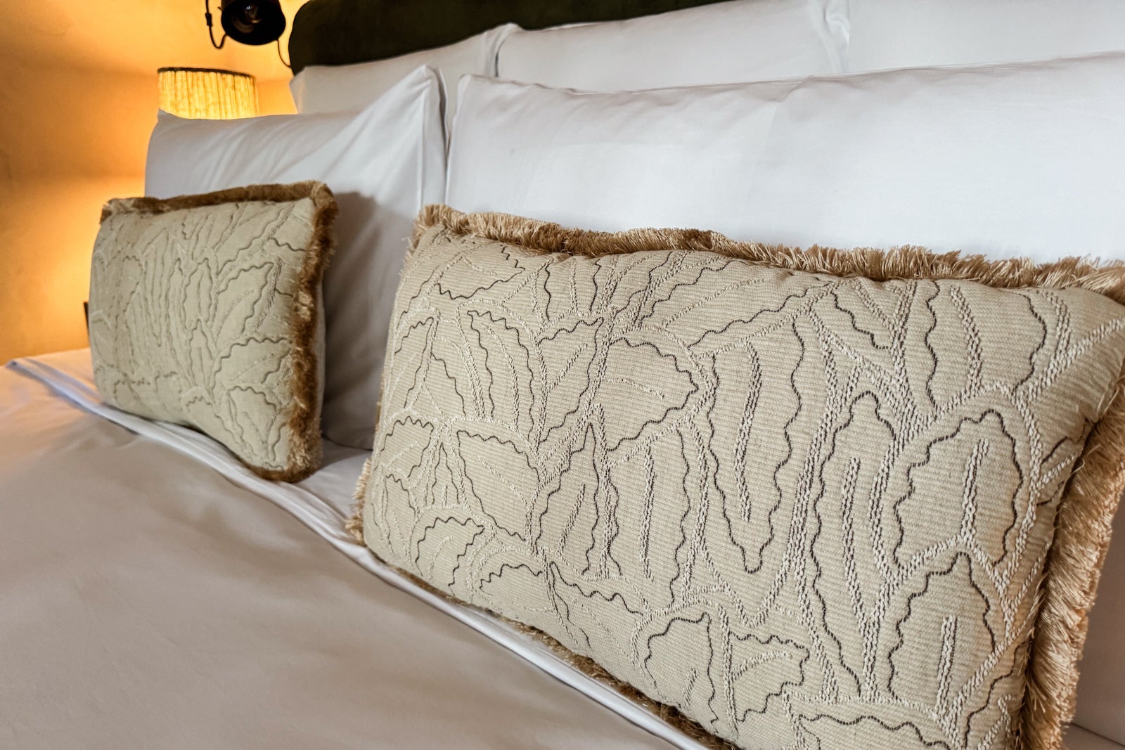 The king-size bed was a welcome respite with seven fluffy pillows (and two throw pillows, along with a throw blanket). I really enjoyed the melding of textures and patterns here.