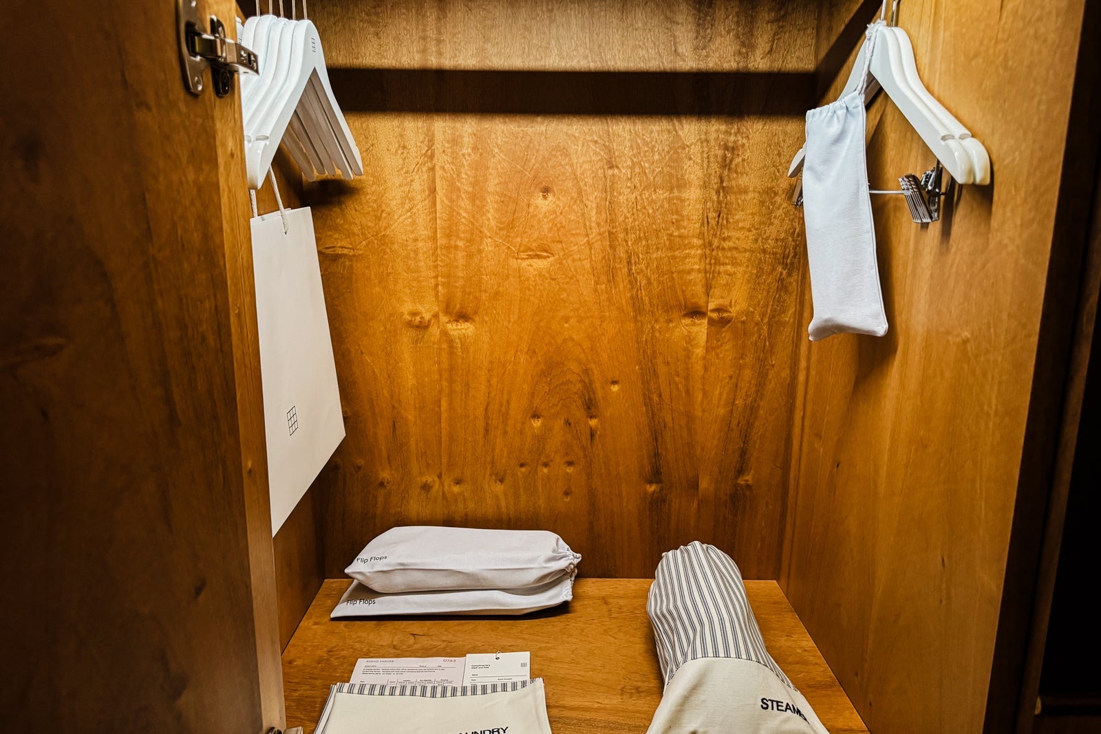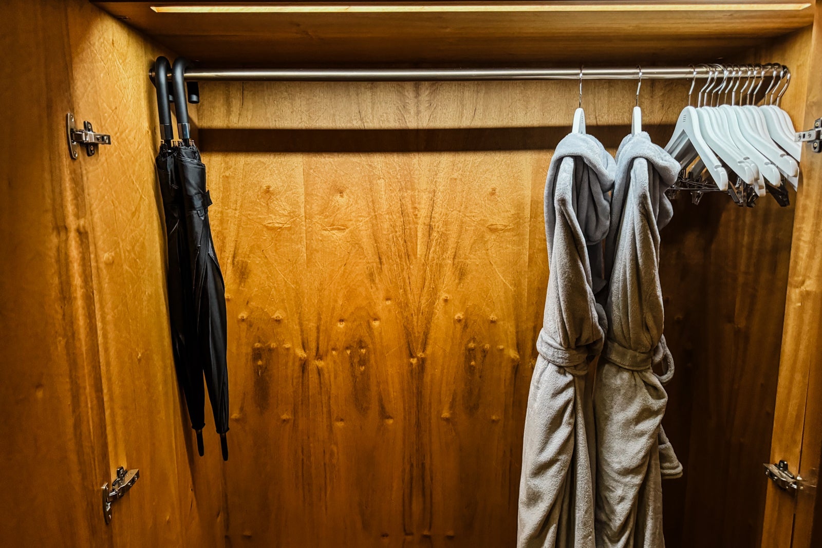 Inside the two-toned wardrobe, there were plenty of hangers, as well as two fluffy bathrobes, two umbrellas, two pairs of flip-flops, a bag and order slip for laundry and a steamer (which saved the day, considering the amount of linen I packed).