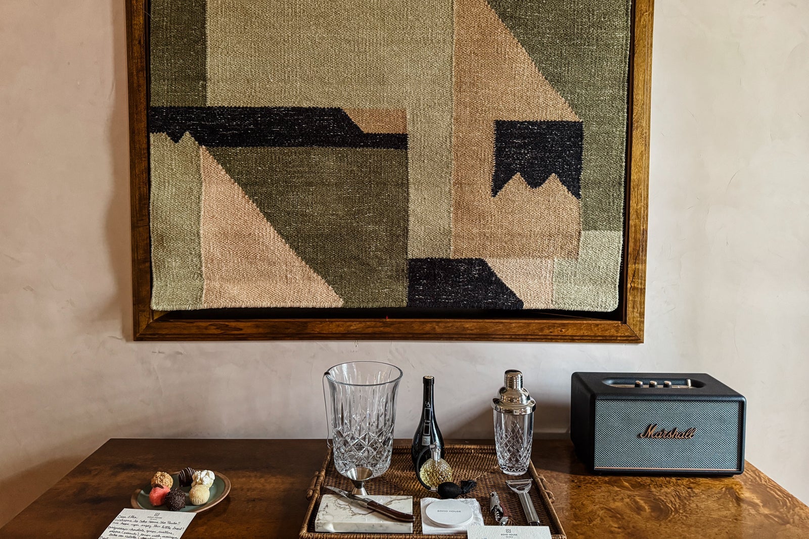 The room's amenities were extensive. The bedroom's main wooden hutch (placed below a beautiful hanging textile, which hid a flat-screen television) featured a glimmering display of perfume, local wine, bottle openers and crystalware.