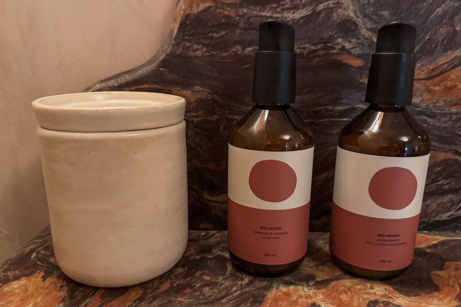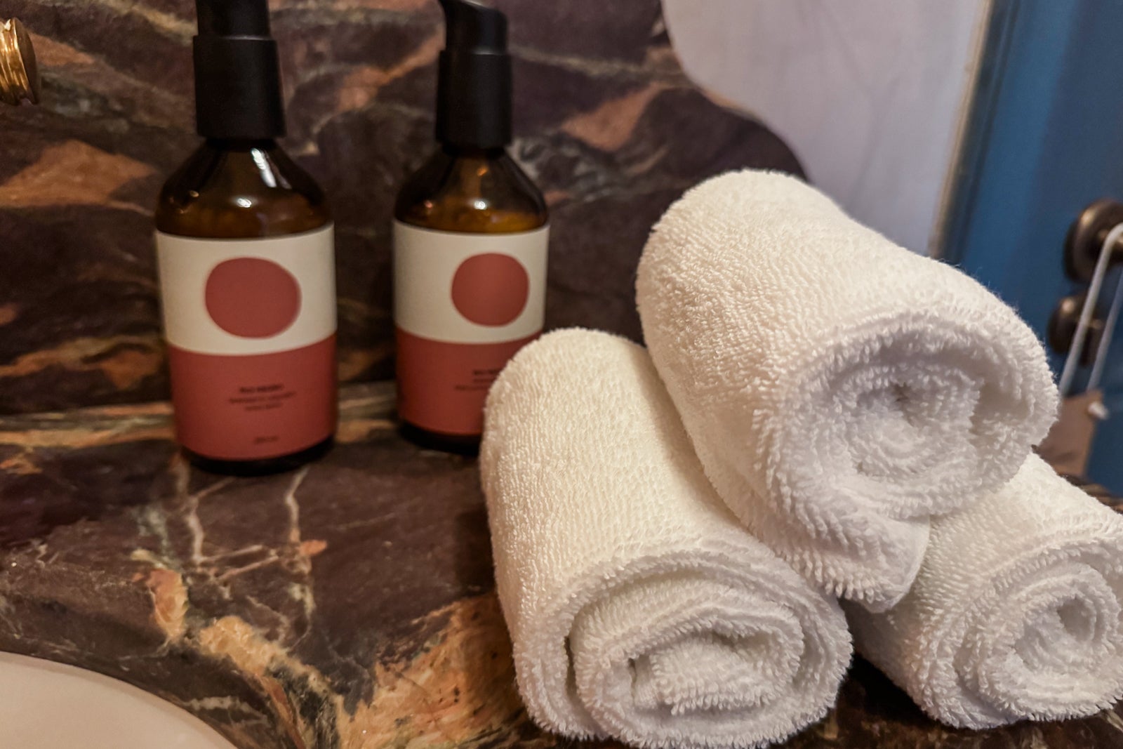 Citrus-scented bath amenities from a local company called Rio Negro flanked both ends of the countertop and were also placed in the shower and by the bedroom's bathtub. Other amenities on the bathroom counter included drinking glasses (replaced daily), a dental kit, mouthwash, tampons, condoms, a shaving kit and a shower cap. Towels were stored underneath: plentiful, white and fluffy. In a small basket under the marble countertop, I found a hair dryer and a flat iron, which was a nice touch.